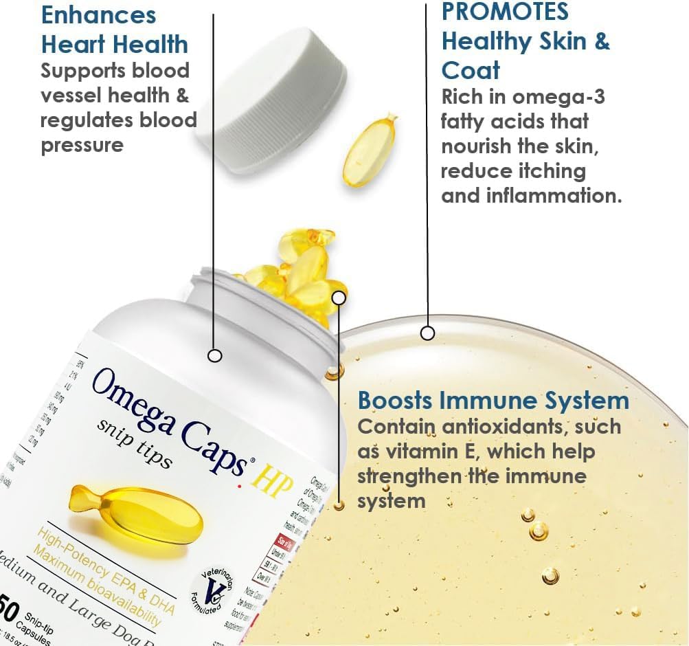 Omega Caps HP Snip Tips for Medium and Large Dogs High Potency EPA and DHA Maximum Bioavailability Fish Oil Supplement Vet Formulated Made in USA Skin Coat Joint and Heart Health 250 Capsules