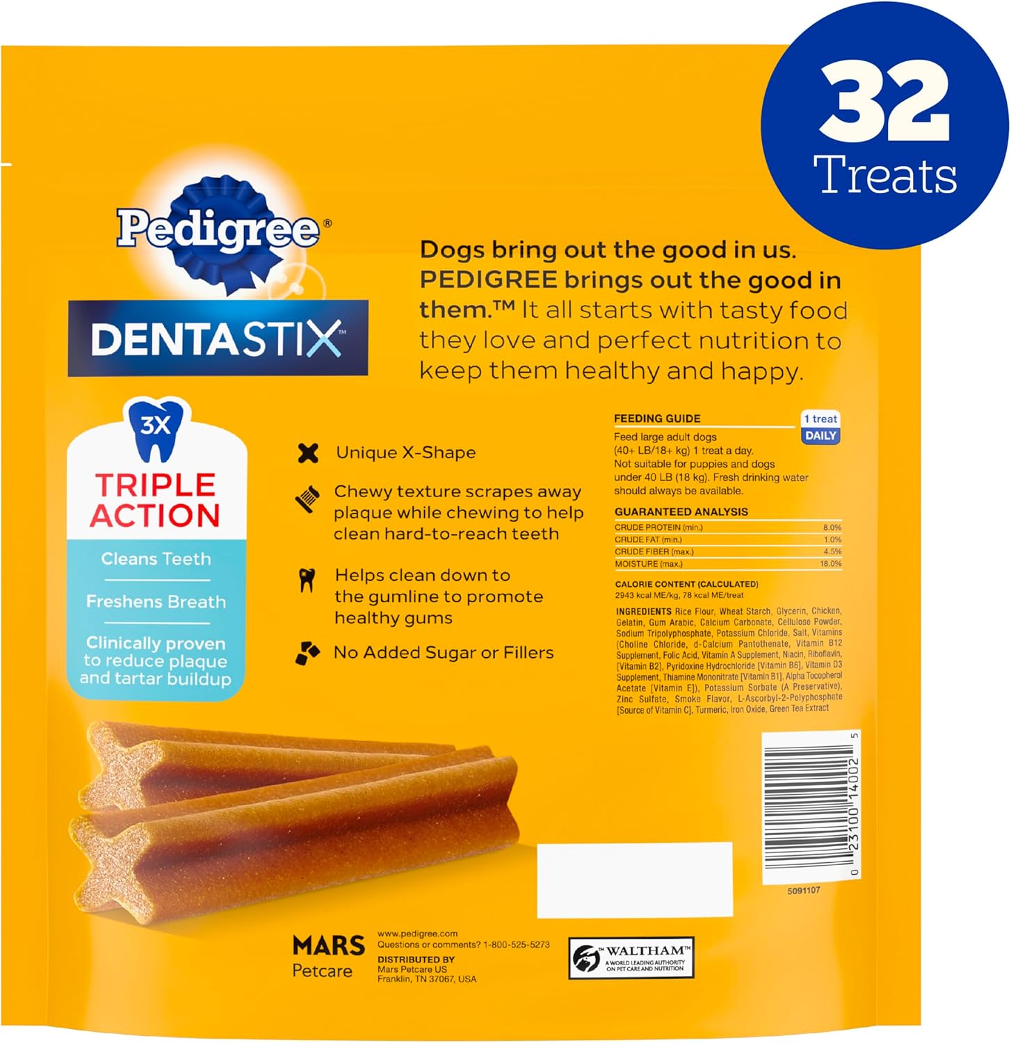 - Triple Action: Pedigree Dentastix Large Breed Dental Care Treats come with triple action which reduces tartar buildup, cleans teeth, and freshens breath