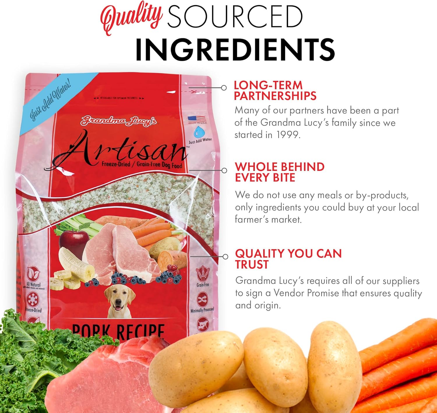 - QUALITY YOU CAN TRUST - A nutritionally balanced blend of highest quality ingredients, freeze-dried pork, fruits and vegetables