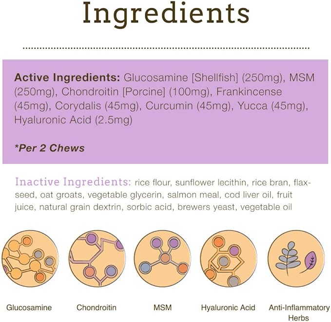 - MSM & ANTI-INFLAMMATORY HERBS PROVIDE NATURAL PAIN RELIEF – While glucosamine, chondroitin, and hyaluronic acid are the foundation of joint health, our advanced joint support formula includes natural ingredients for dog pain relief. Frankincense, curcumin, corydalis, and yucca reduce inflammation and provide immediate herbal pain relief for dogs.