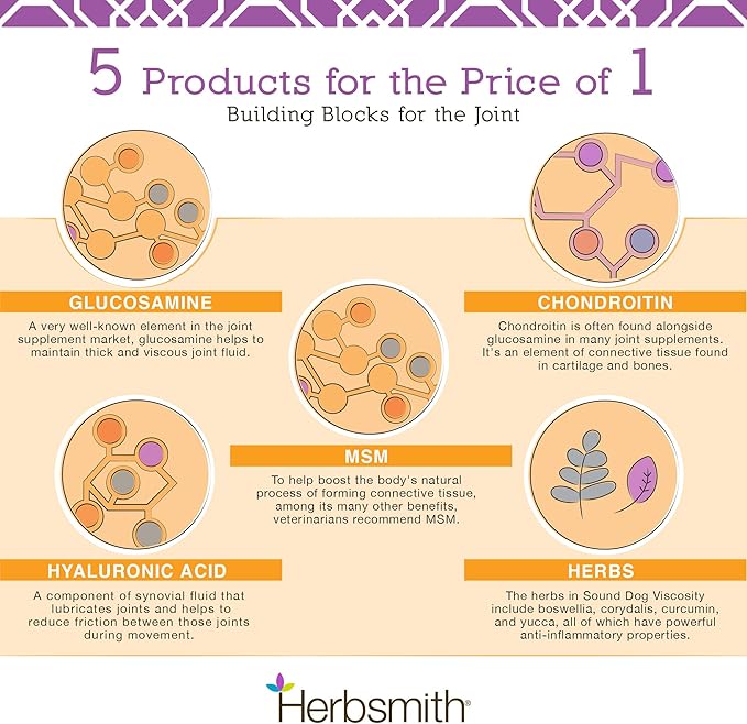 - THERAPEUTIC LEVELS OF INGREDIENTS – The recommended glucosamine for dogs weighing 50lbs is 1500 mg per day, and that’s exactly what you will find in a daily dose of Sound Dog Viscosity. Any amount of glucosamine is better than none, but to truly provide joint help for dogs, you need a supplement with therapeutic levels of active ingredients.