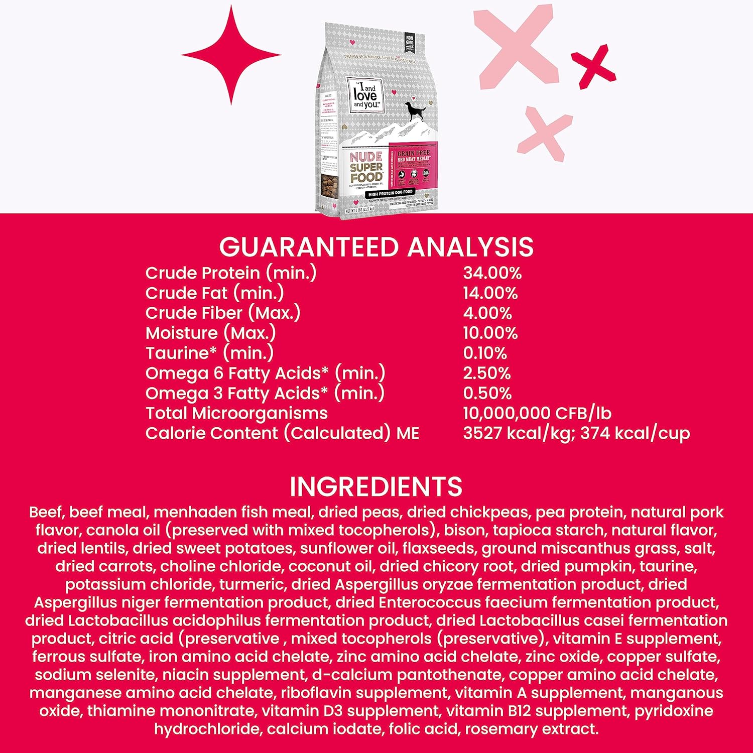 I and love and you Nude Super Food Dry Dog Food - Red Meat Medley - Prebiotic + Probiotic, Grain Free, Real Meat, No Fillers, 23lb Bag