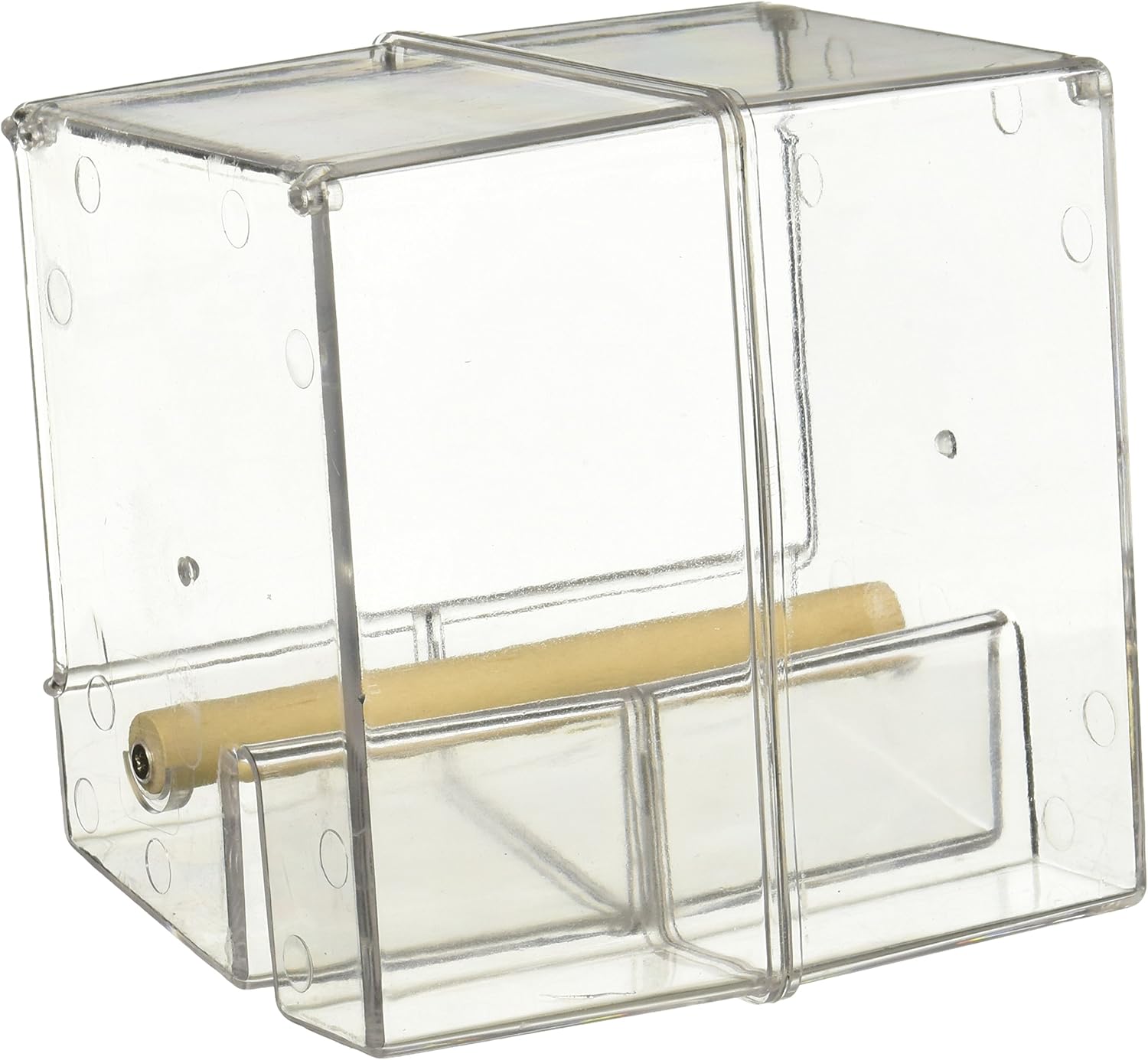 - You’ll be whistling a happy tune when you use this no-mess clear acrylic box feeder system for your small bird; it attaches easily to the cage, eliminates seed scatter, and eases cleanup