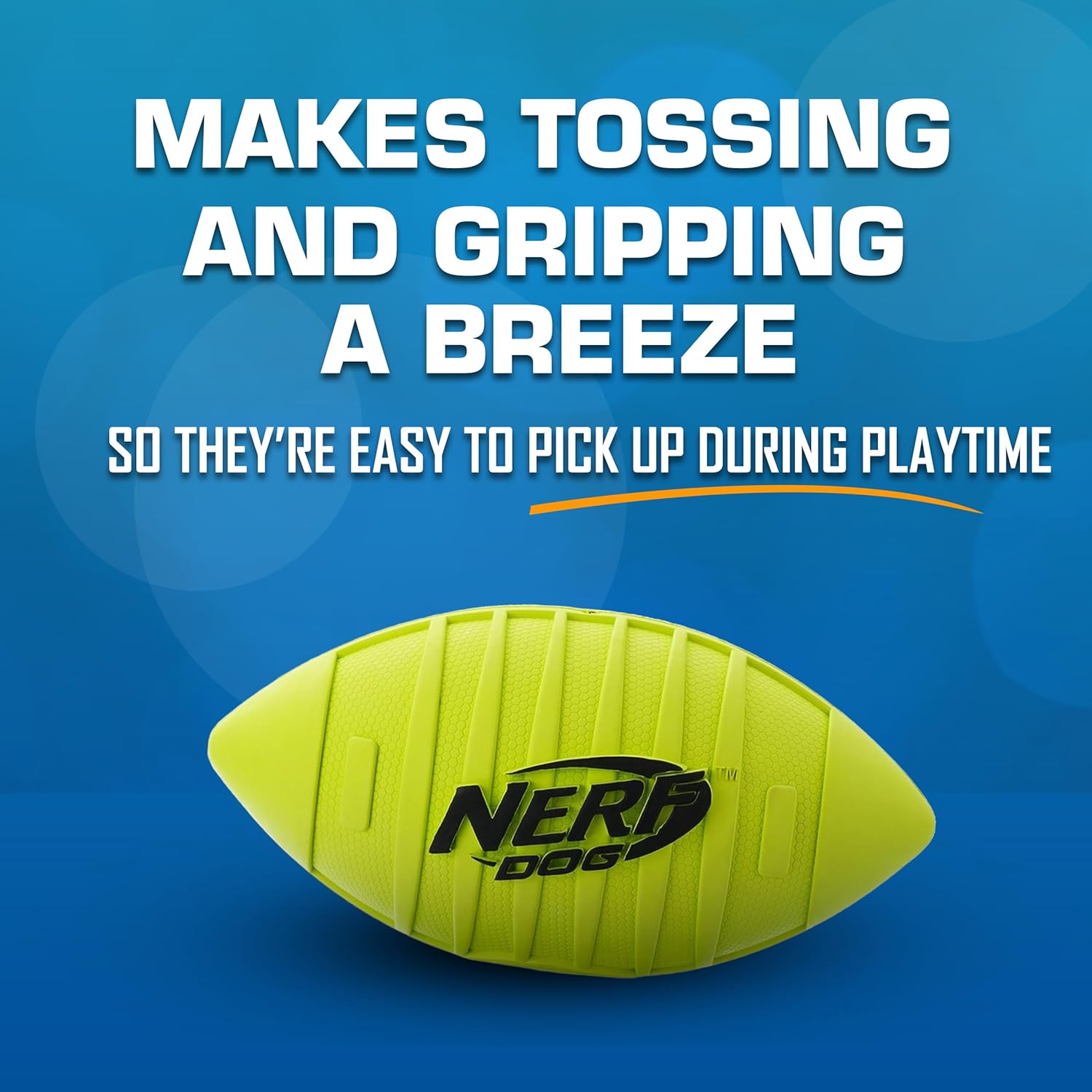 - Squeaky Dog Football Toy: Each Nerf Dog Green Blitz Football outdoor dog toy is 7 inches in length, making them ideal dog fetch toys for large dogs and medium dogs