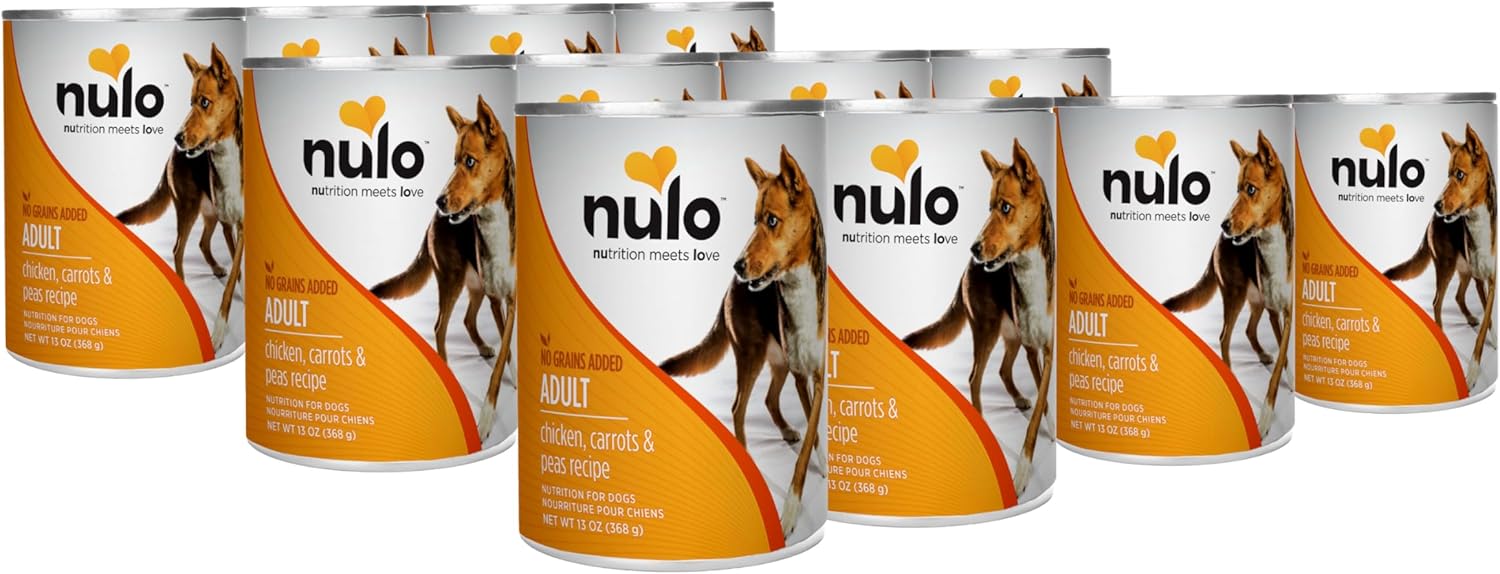 - CHICKEN, CARROTS, & PEAS RECIPE -Nulo All Breed Adult Wet Canned Dog Food contains a beneficial mix of vitamins, minerals, and antioxidants for a healthy immune system and improved digestive health. Pack of 12, 13 Oz each.