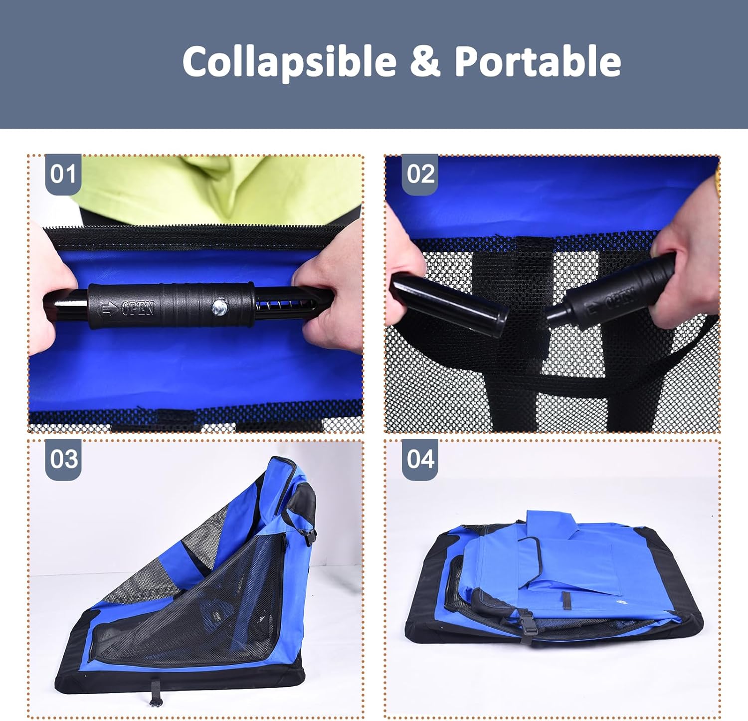 - Collapsible Dog Kennel: Three mesh entrances door (Top, front and side) for convenience sunlight and breathability; Ample Ventilation for Use in All Season. Easy carry with handle or strap. Adjustable strap included.