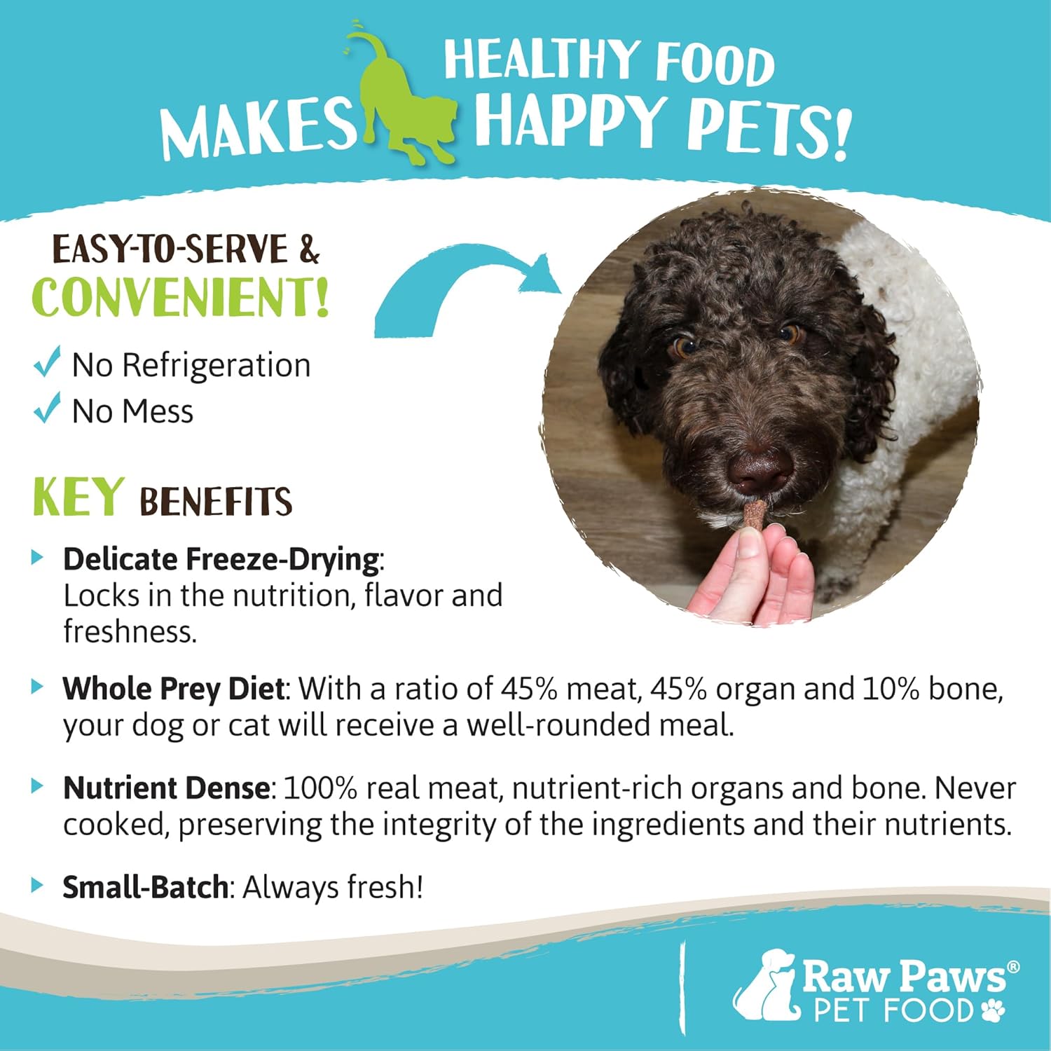 - HEALTHY BENEFITS OF RAW: Serve Raw Paws high protein dog food and cat food as a highly nutritious meal, snack, or cat and dog food topper for any diet…raw, wet, or dry. Beef freeze dried dog food, ideal for pets with food sensitivities, pets that are overweight, diabetic, have allergies, or gastrointestinal disorders. Enjoy the mouthwatering taste of real raw cat food and receive all the benefits & nutrients of raw.
