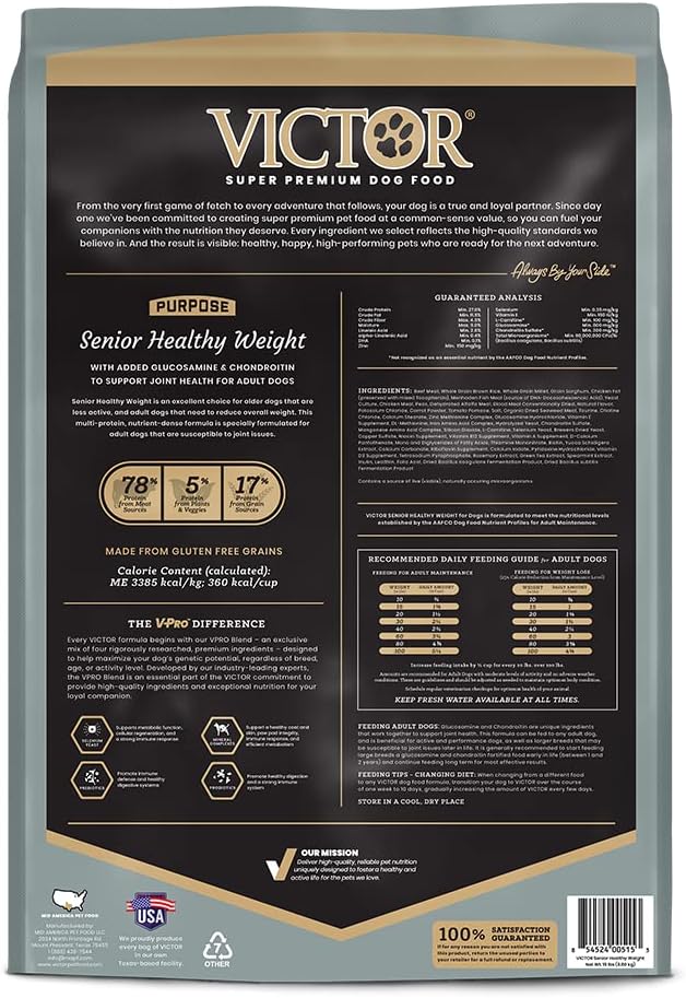 VICTOR Super Premium Dog Food – Purpose – Senior Healthy Weight Management – Dry Dog Food for Adult Dogs – Gluten Free with Glucosamine and Chondroitin, for Hip and Joint Health, 15lbs
