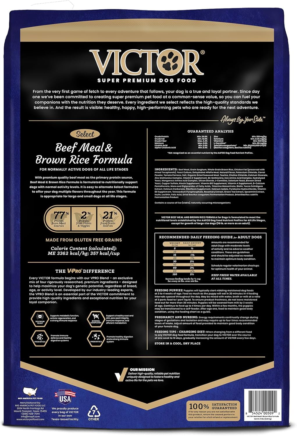 VICTOR Super Premium Dog Food – Select Beef Meal & Brown Rice Formula for Immune and Gut Health – Gluten-Free Beef Meal Dry Dog Food for All Normally Active Dogs of All Life Stages, 15 lbs