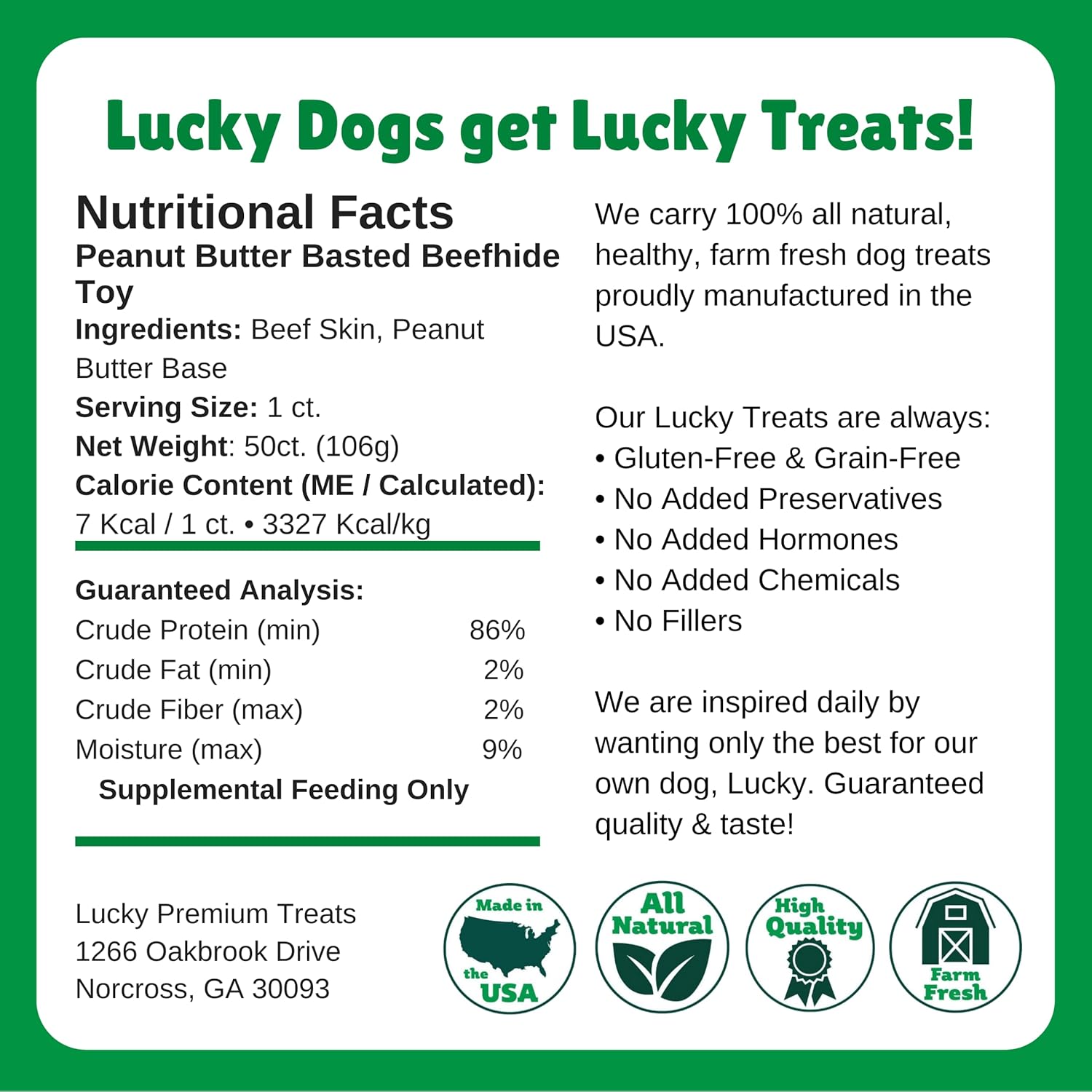 Lucky Premium Treats Peanut Butter Basted Rawhide – All-Natural Rawhide and Peanut Butter Dog Treats for Extra Small Dogs, Gluten Free Premium Toy Breed Dog Treats (50 Chews)