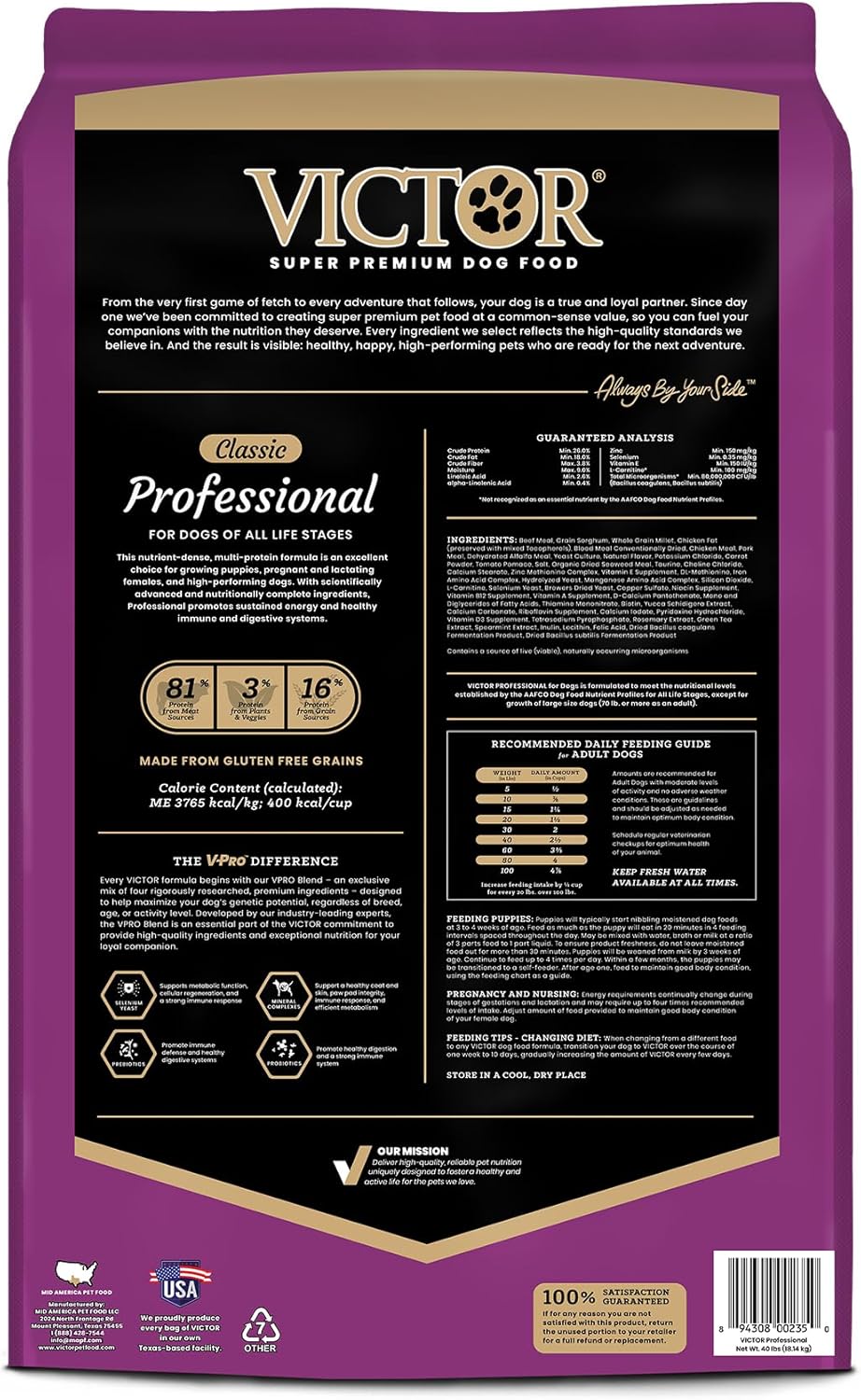 - PROFESSIONAL DOG FOOD: VICTOR Professional dog food is a gluten free, 26% protein kibble that has been popular with active and sporting dogs for years. This dog food keeps your pet active and vibrant, promoting their endurance and performance during all life stages.