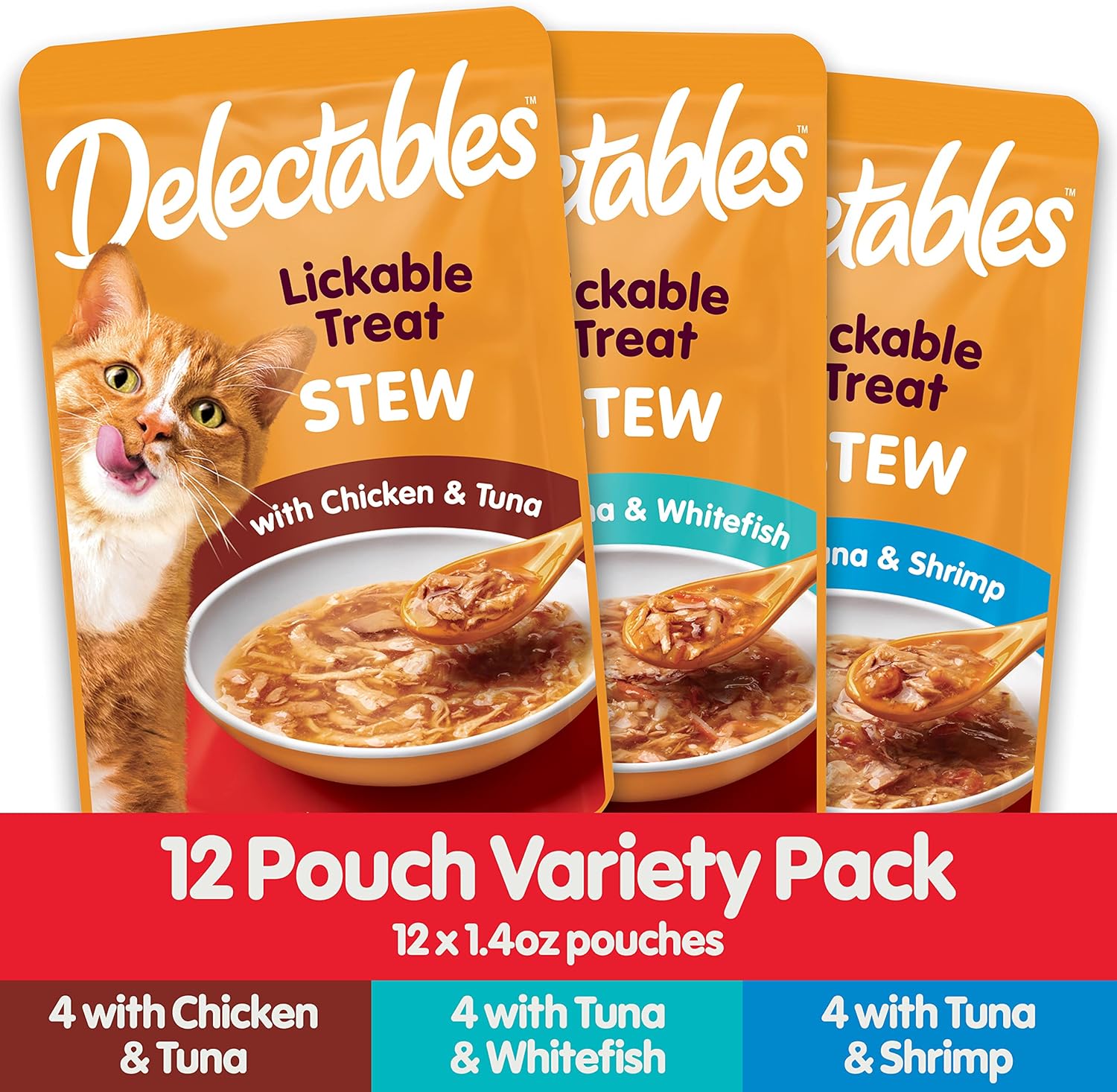- CONTAINS: This pack of Delectables Stew contains twelve (12) 1.4-ounce lickable cat treats.