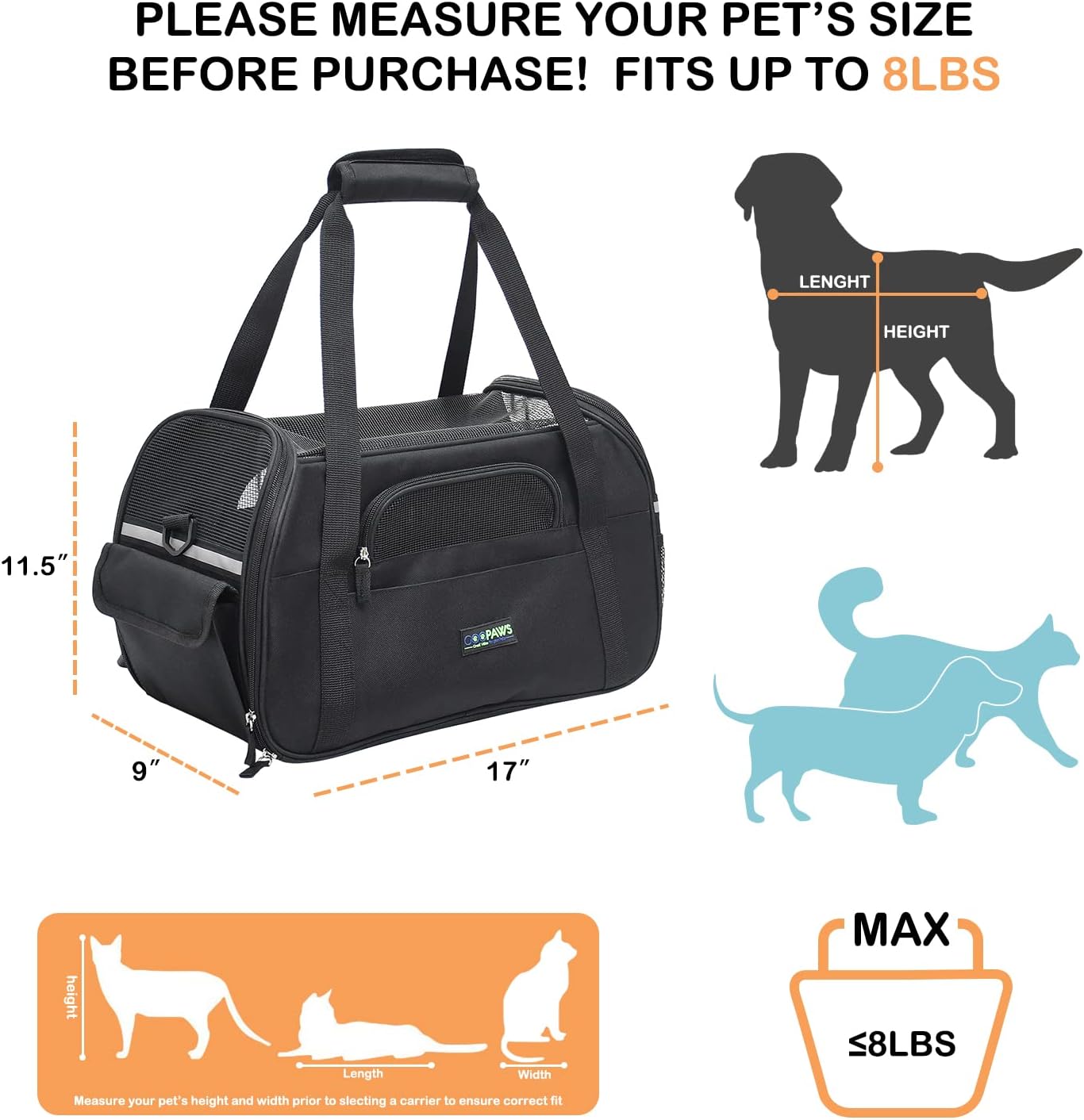 - Size: 17" L x 9" W x 11.5" H. Compliant with most Airlines and best suited for kittens, puppies, teacup breeds and ferrent smaller than 8 pounds. All dimensions are measured manually, please allow deviation of 1 inch.