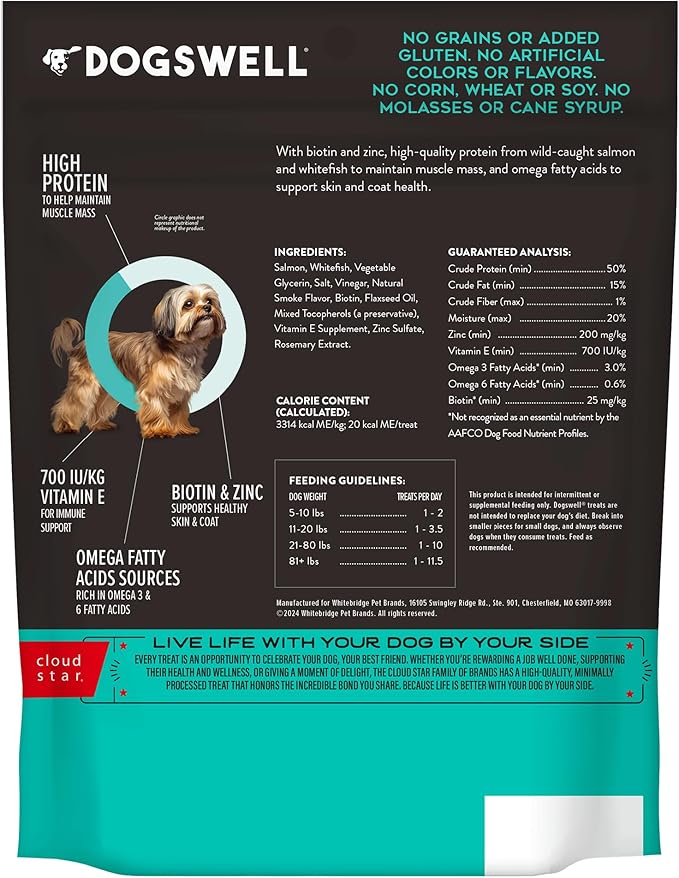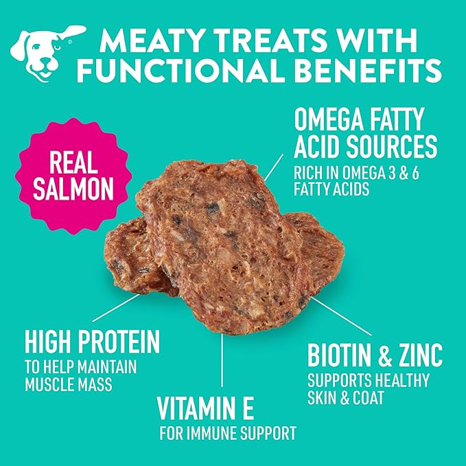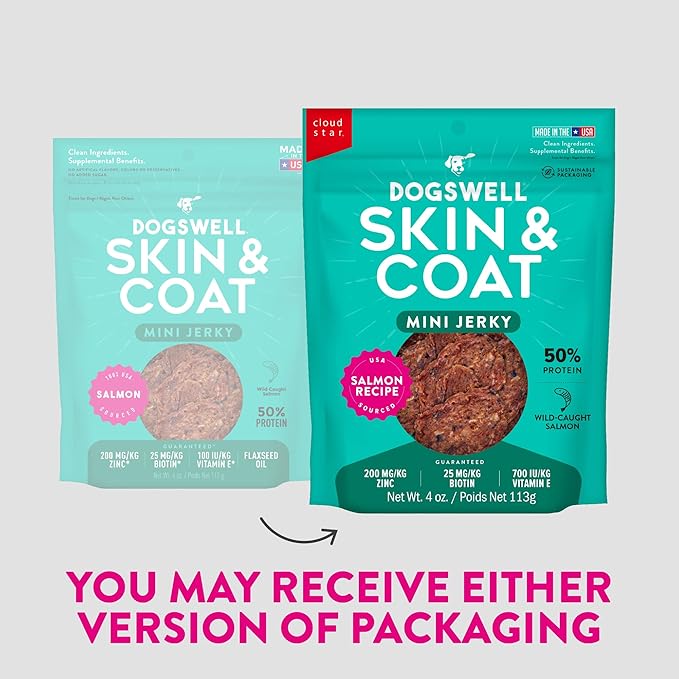 - SUPPORT THEIR SKIN & COAT Each piece of this delicious jerky is formulated with a special blend of ingredients such as biotin and zinc to support healthy skin and coat, vitamin E for immune support, and omega fatty acids from salmon and whitefish.
