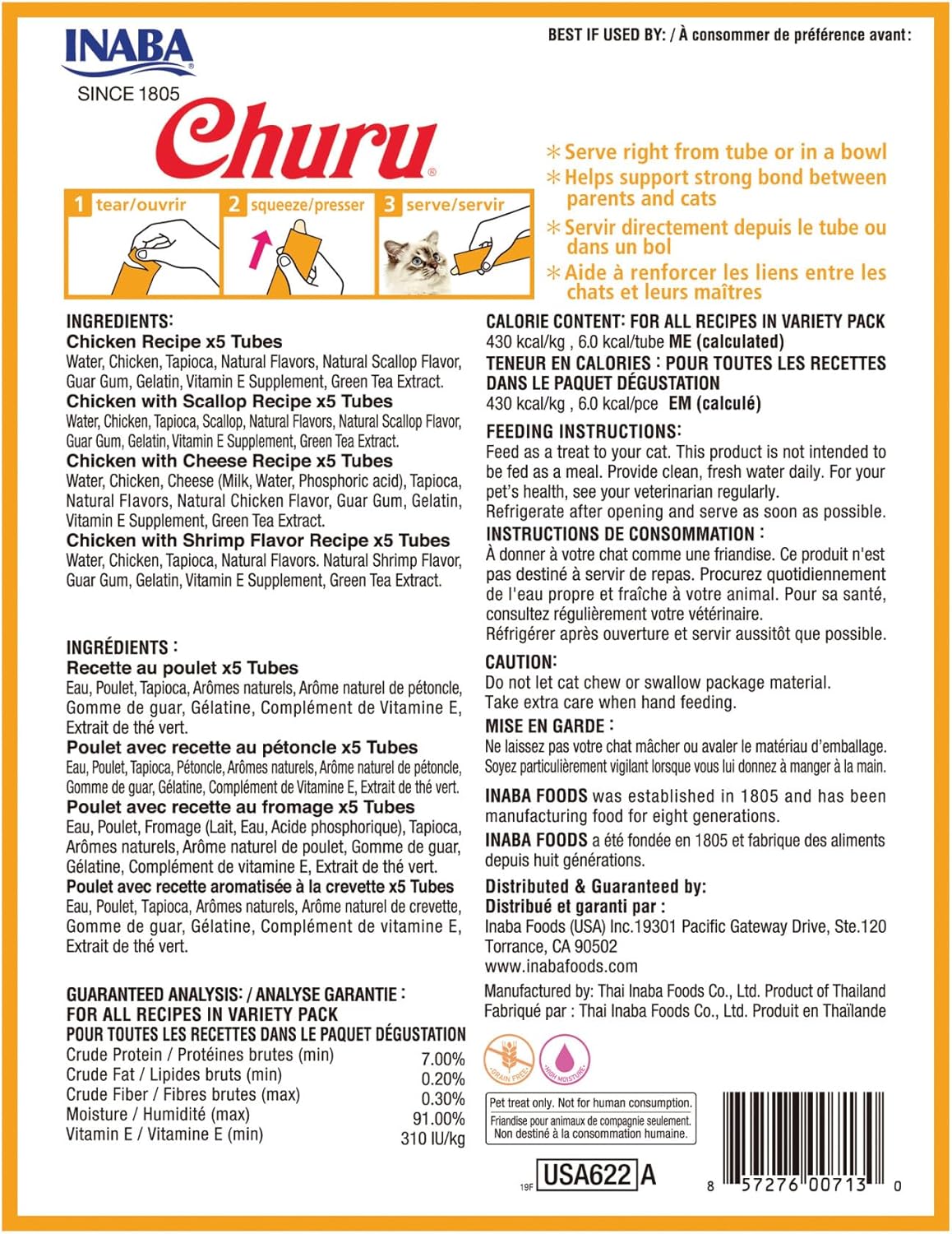 INABA Churu Cat Treats, Grain-Free, Lickable, Squeezable Creamy Purée Cat Treat/Topper with Vitamin E & Taurine, 0.5 Ounces Each Tube, 20 Tubes, Chicken Variety