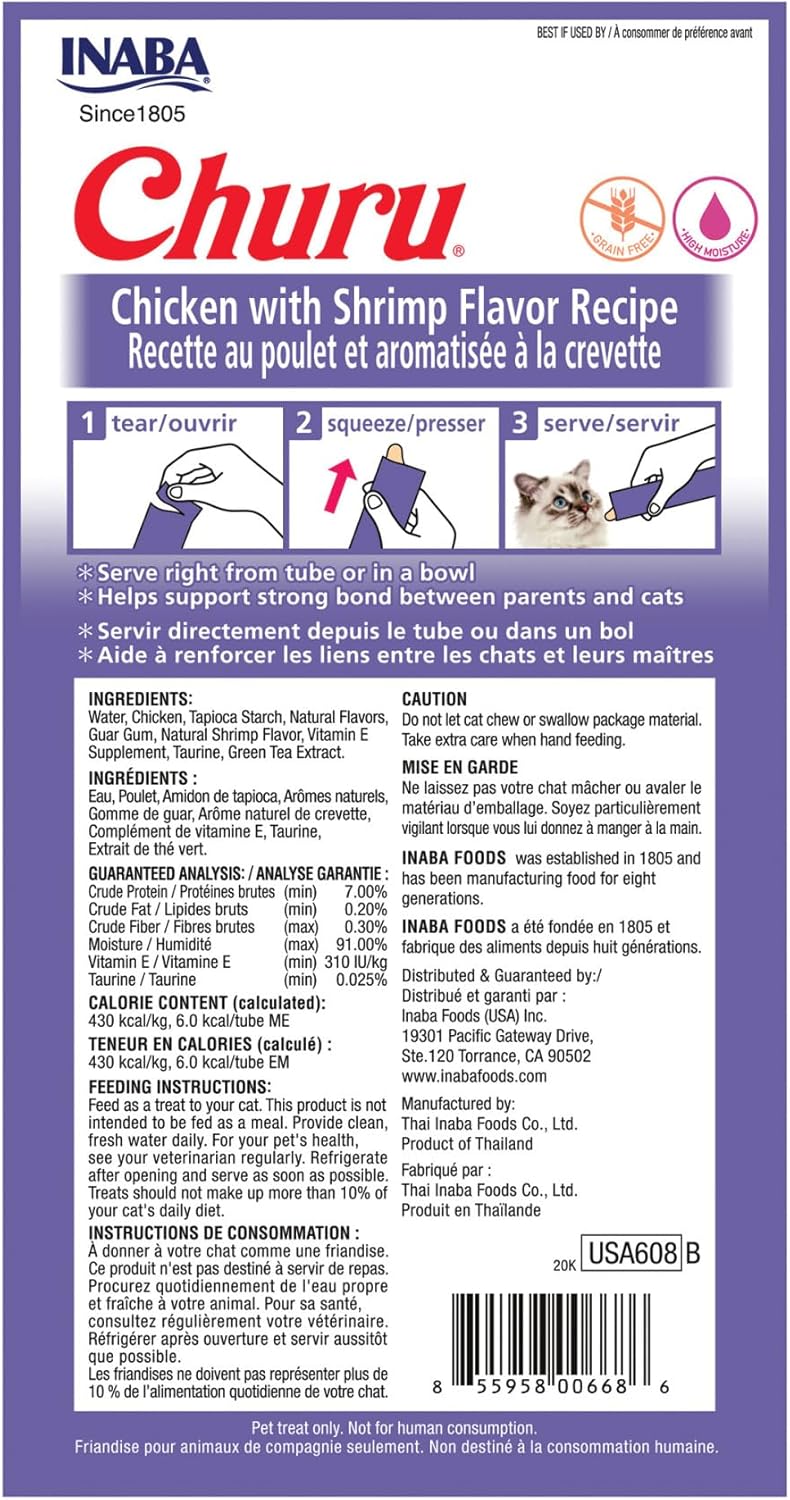 INABA Churu Cat Treats, Grain-Free, Lickable, Squeezable Creamy Purée Cat Treat/Topper with Vitamin E & Taurine, 0.5 Ounces Each Tube, 24 Tubes (4 per Pack), Chicken with Shrimp Recipe