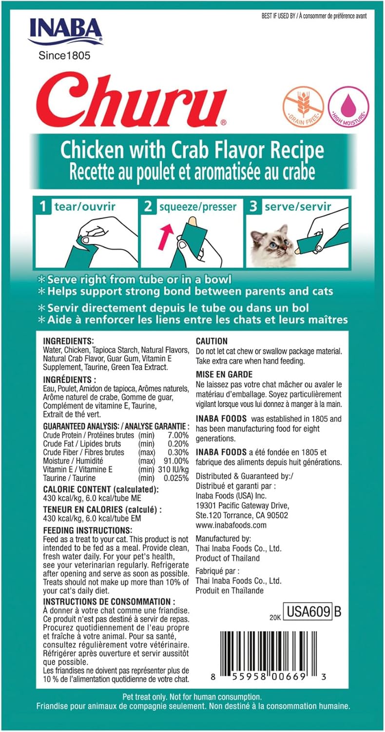 INABA Churu Cat Treats, Grain-Free, Lickable, Squeezable Creamy Purée Cat Treat/Topper with Vitamin E & Taurine, 0.5 Ounces Each Tube, 24 Tubes (4 per Pack), Chicken with Crab Recipe