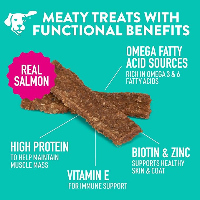 - SUPPORT THEIR SKIN & COAT Each piece of this delicious jerky is formulated with a special blend of ingredients such as biotin and zinc to support healthy skin and coat, vitamin E for immune support, and omega fatty acids from salmon and whitefish.