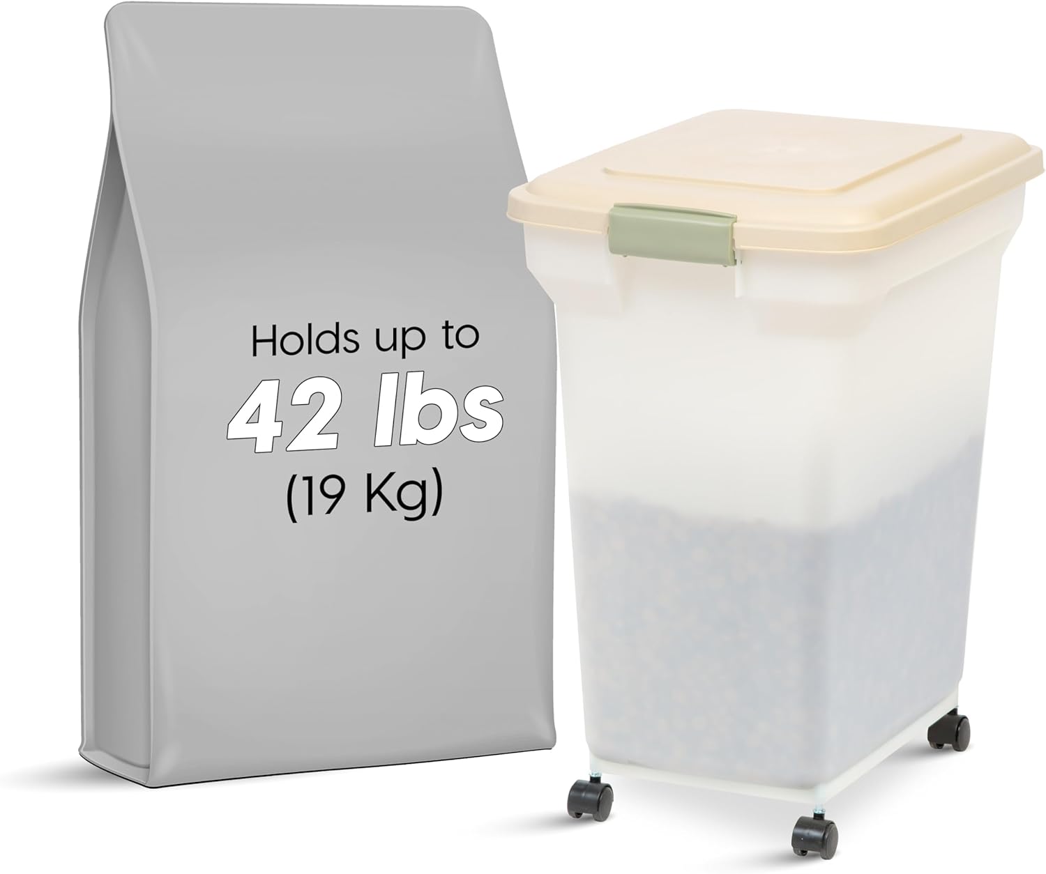 IRIS USA Airtight Dog Food Storage Container, WeatherPro, Up to 40 lbs, Removable Wheels, for Dog Cat Bird and Other Pet Food Storage Bin, Keep Fresh, Translucent Body, Made in USA, Pearl/Almond