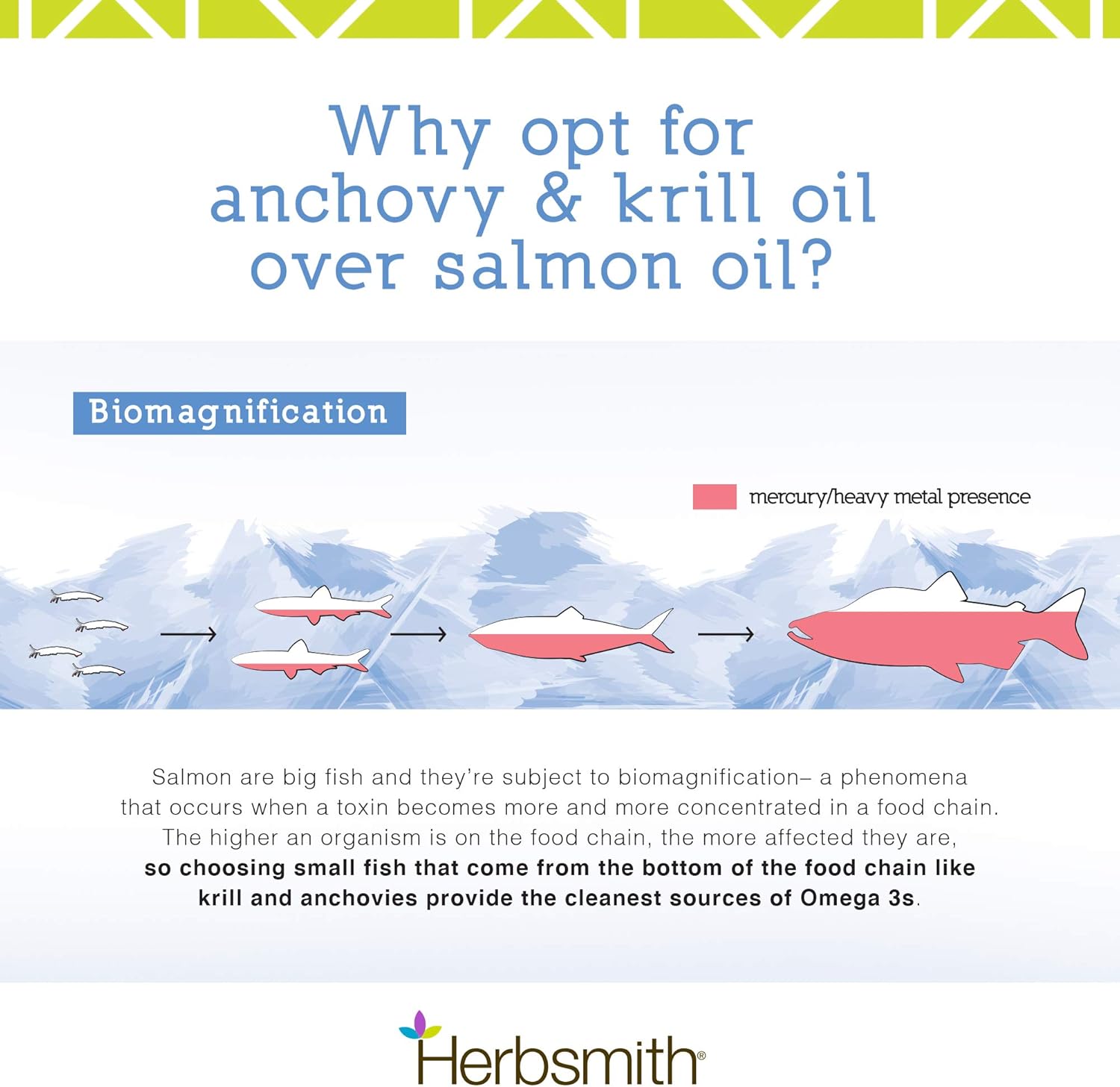 - CLEANER SOURCE OF OMEGA 3s- FREE FROM TOXINS - We opt for anchovy and krill oil over salmon oil for our source of Omega 3. Why? We live in a toxic world, salmon included. Being near the top of the food chain, they consume higher amounts of heavy metals (they absorb whatever the smaller fish eats, toxins and all). Anchovy and krill are near the bottom of the food chain which means a lower risk of toxins and heavy metals and are more than likely, cleaner omega 3 sources.