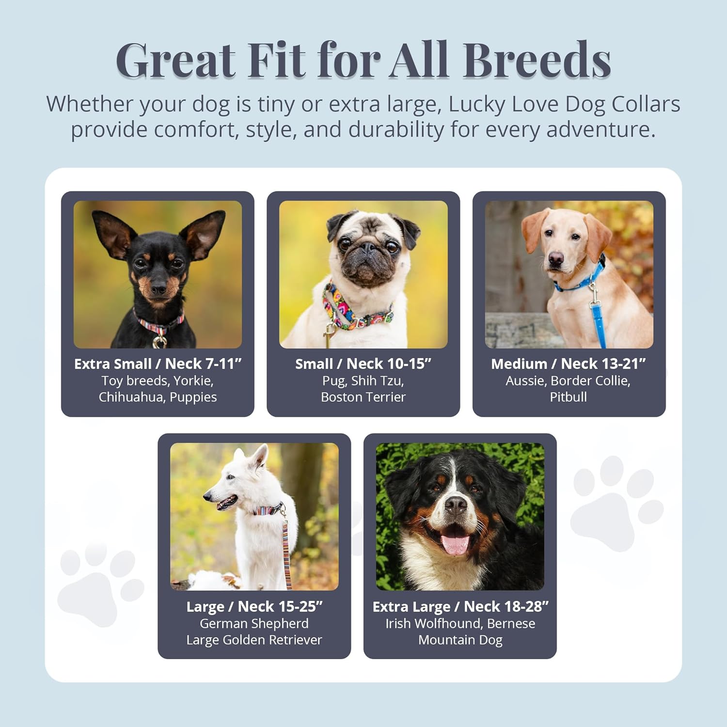 - 🤍CONVENIENT AND RELIABLE - EASY CLICK ON/OFF COLLAR BUCKLE GETS YOU AND YOUR DOG OUT THE DOOR QUICKLY! Our collars are durably constructed with an easy click, strong buckle, weatherproof D ring and HIGH DENSITY nylon. Our soft and flexible collars are dog approved – they are super comfortable, as well as long lasting. Washable by hand or on gentle cycle. Lucky Love Dog adjustable collars come in four or five sizes (depending on pattern). SEE SIZING BELOW