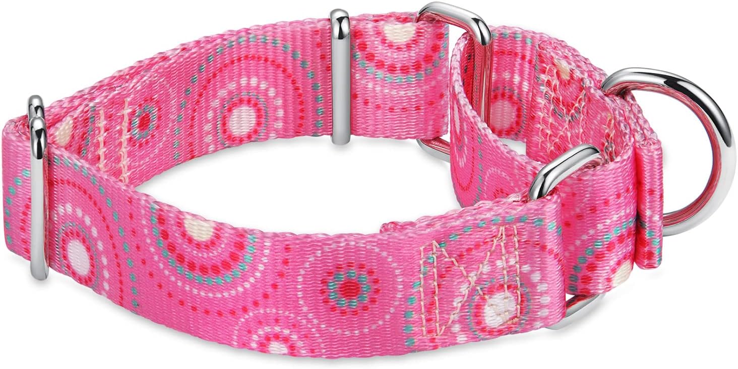 Fashion Print and Unique Geometric Pattern Martingale Dog Collar, Silky Soft Safety Training Collars for Small to Large Dogs (Medium, 1 Inch Wide, Firework Dots -Pink)