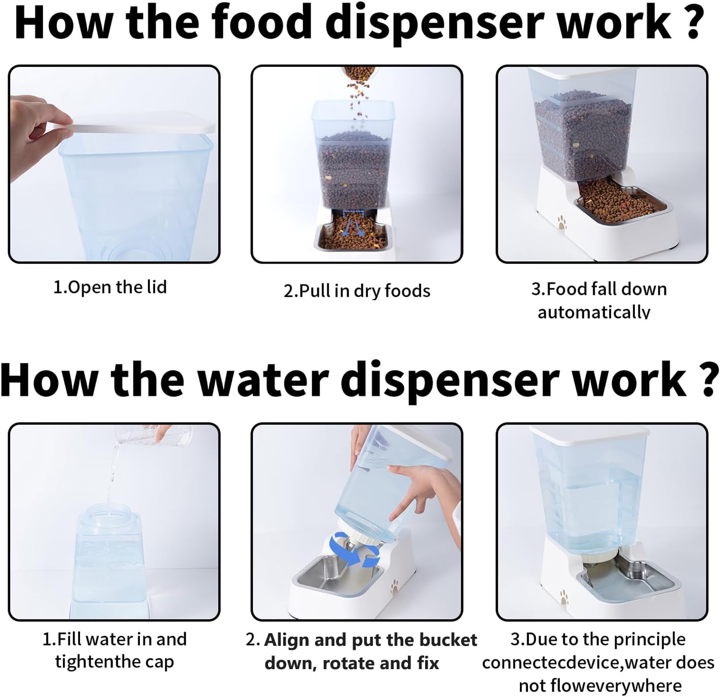 - 🐶Automatic food feeder and waterer dispenser set: Fill up with water and food, you can easily go out, work or short-term travel, saving you time. No more daily feeding.