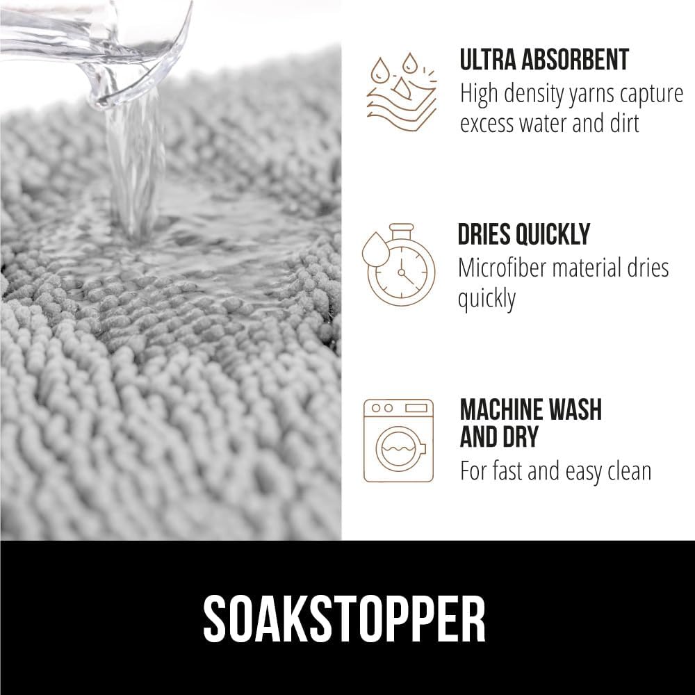- SOAK STOPPER from GORILLA GRIP: the original Gorilla Grip Soak Stopper mat is highly absorbent, featuring an extra-absorbent top layer, its dense chenille pile absorbs excess moisture, helping to keep floors clean from the toughest messes