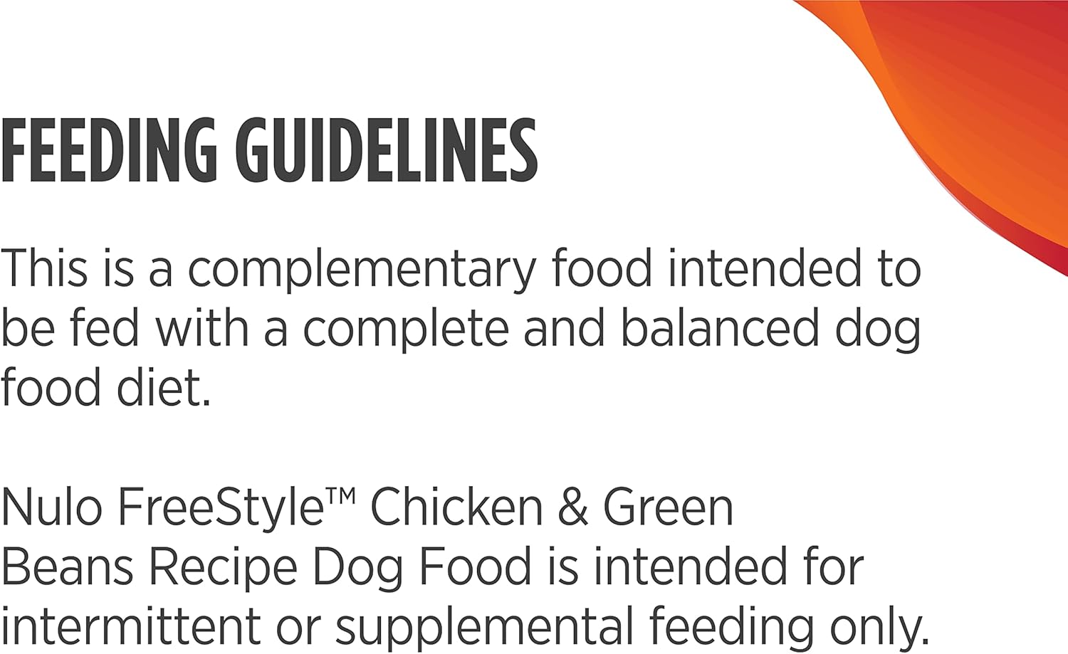 - CHICKEN and GREEN BEANS RECIPE - Nulo Freestyle Puppy and Dog Wet Food Toppers have no grains, artificial flavors, or preservatives. These real meat dog toppers feature natural animal-based protein and only 3 wholesome ingredients in each pouch. Pack of 24, 2.8 Oz each.