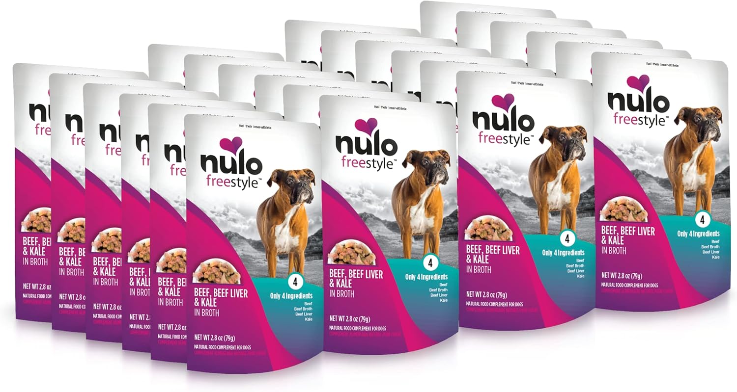 - BEEF, BEEF LIVER, & KALE RECIPE - Nulo Freestyle Puppy & Dog Wet Food Toppers have no grains, artificial flavors, or preservatives. These real meat dog toppers feature natural animal-based protein and only 3 wholesome ingredients in each pouch. Pack of 24, 2.8 Oz each.