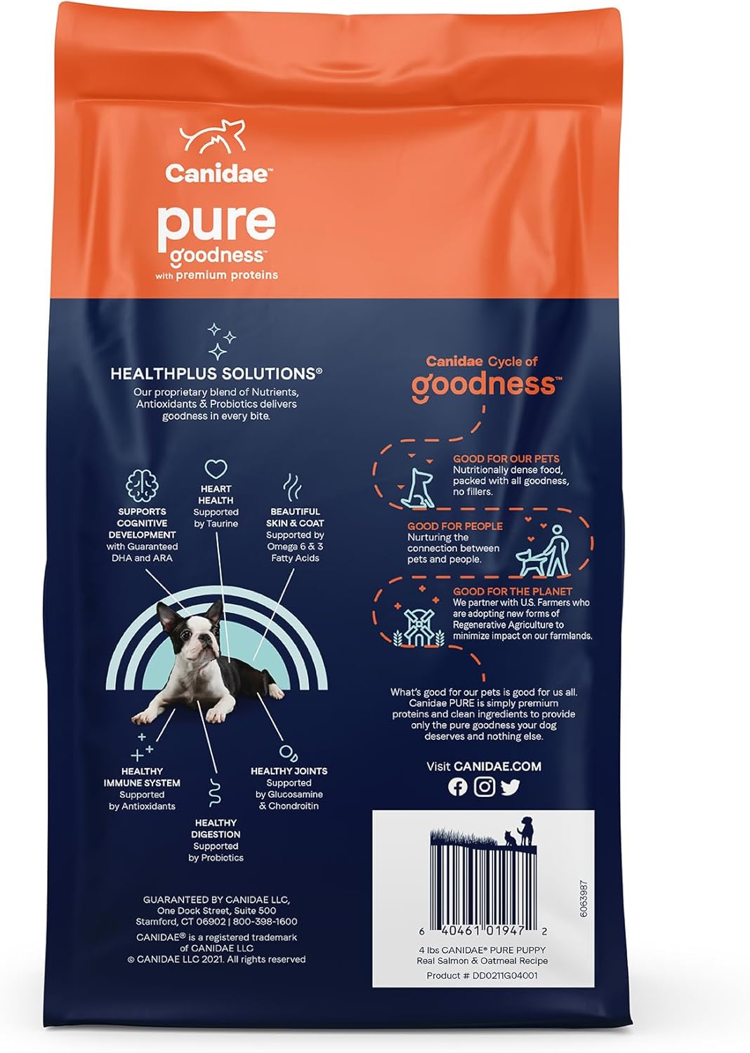 - Contains 1- 4 lb. Bag of Canidae Pure Salmon and Oatmeal Recipe Dry Dog Food for Puppies