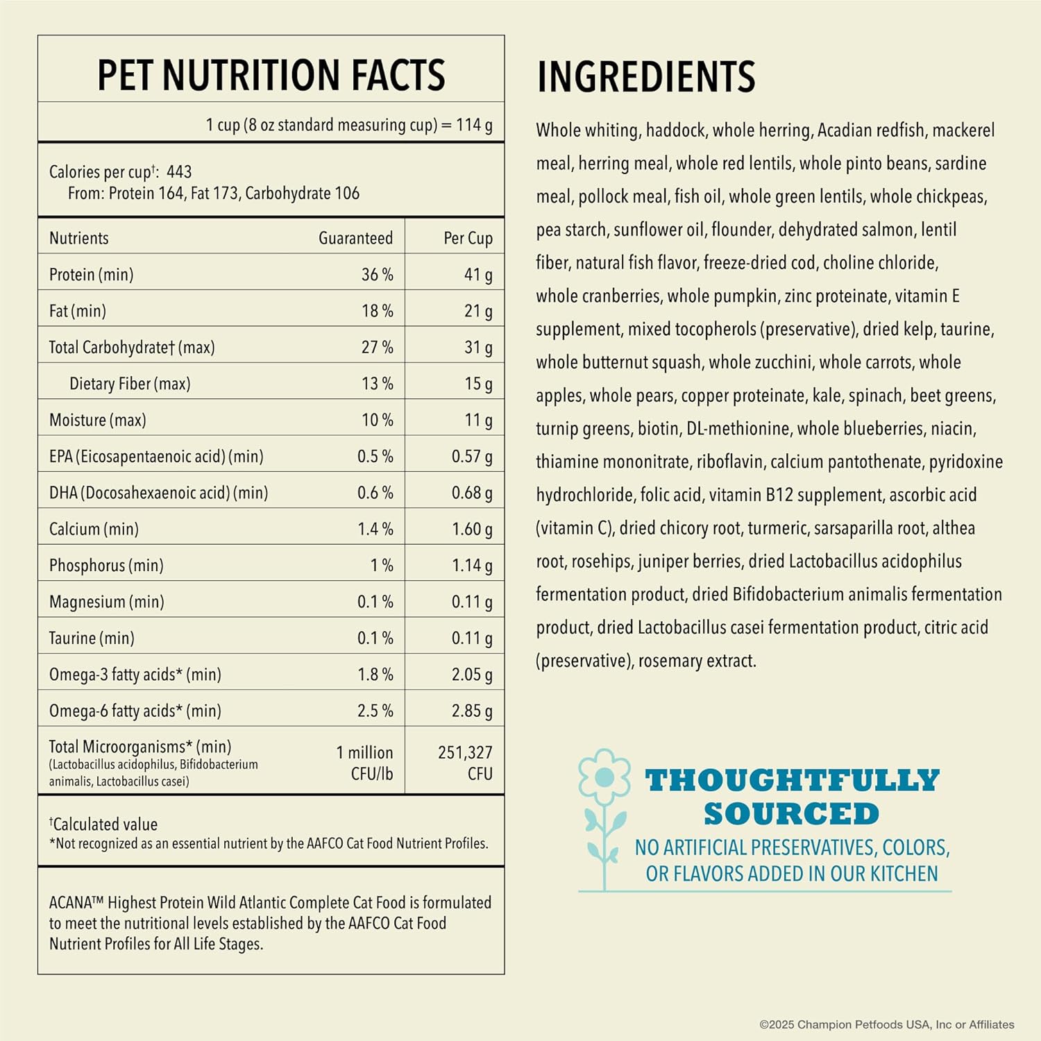 - Grain free*** dry cat food never includes artificial flavors, colors or preservatives and ACANA never adds soy, corn, tapioca or wheat