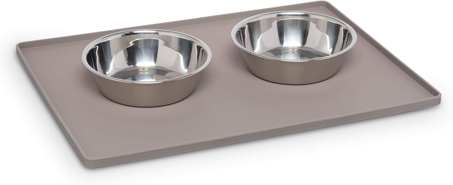 Messy Mutts & Cats Silicone Non-Slip Pet Bowl Mat with Raised Edge | 16” x 12” Dog/Cat Bowl Mat with Spill-Proof Lip | Grey