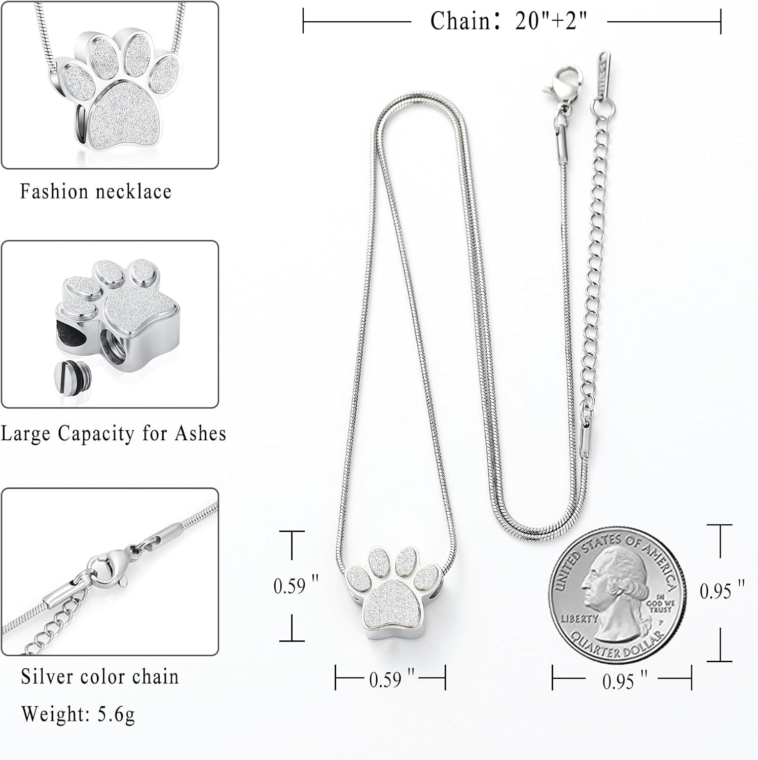 - 🐶 The unique【Paw Dog Cremation Pendant】is desighed for 0.58" * 0.98“ perfect size.One 20" chain + 2" extension chain + beautiful gift box.