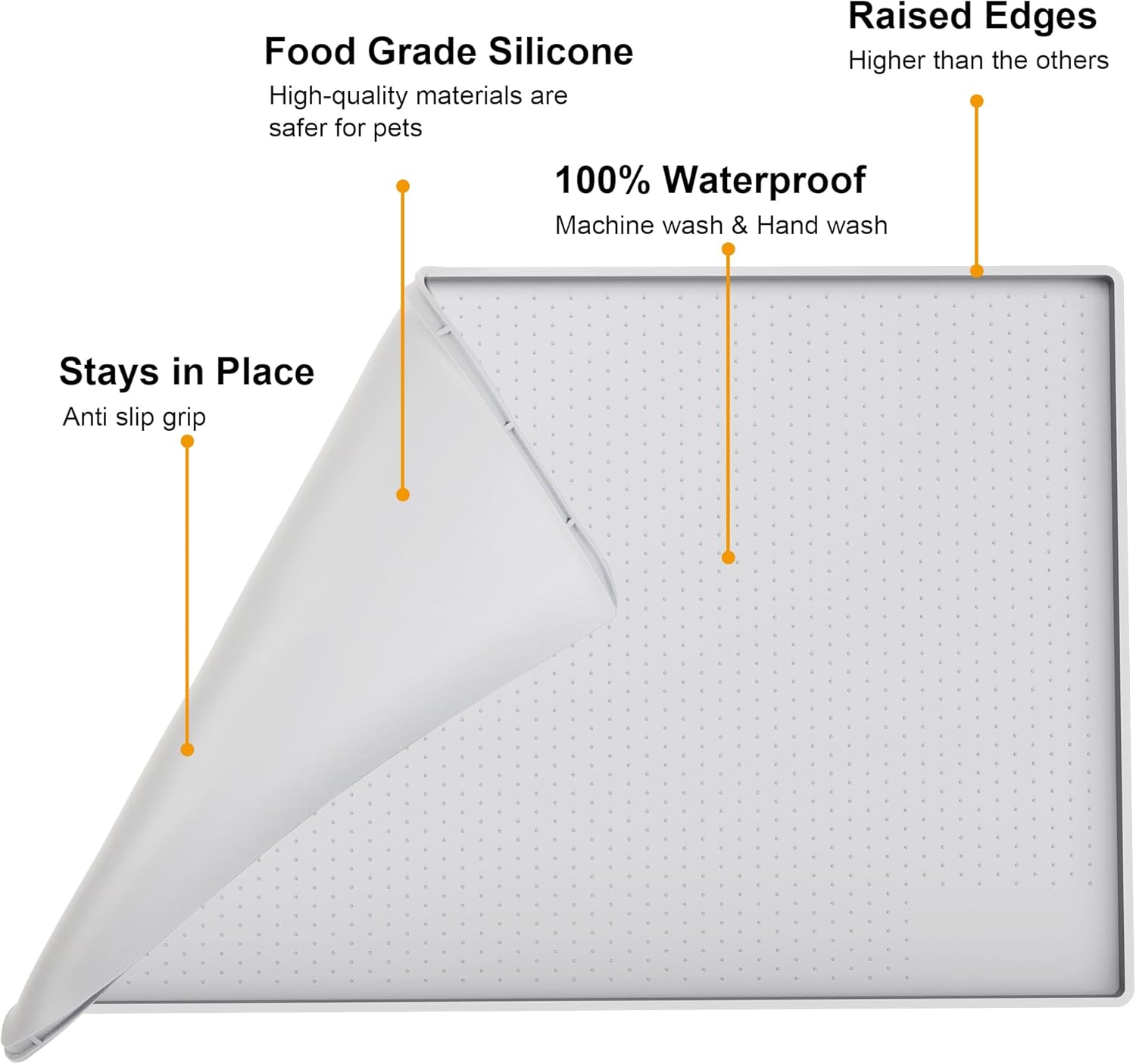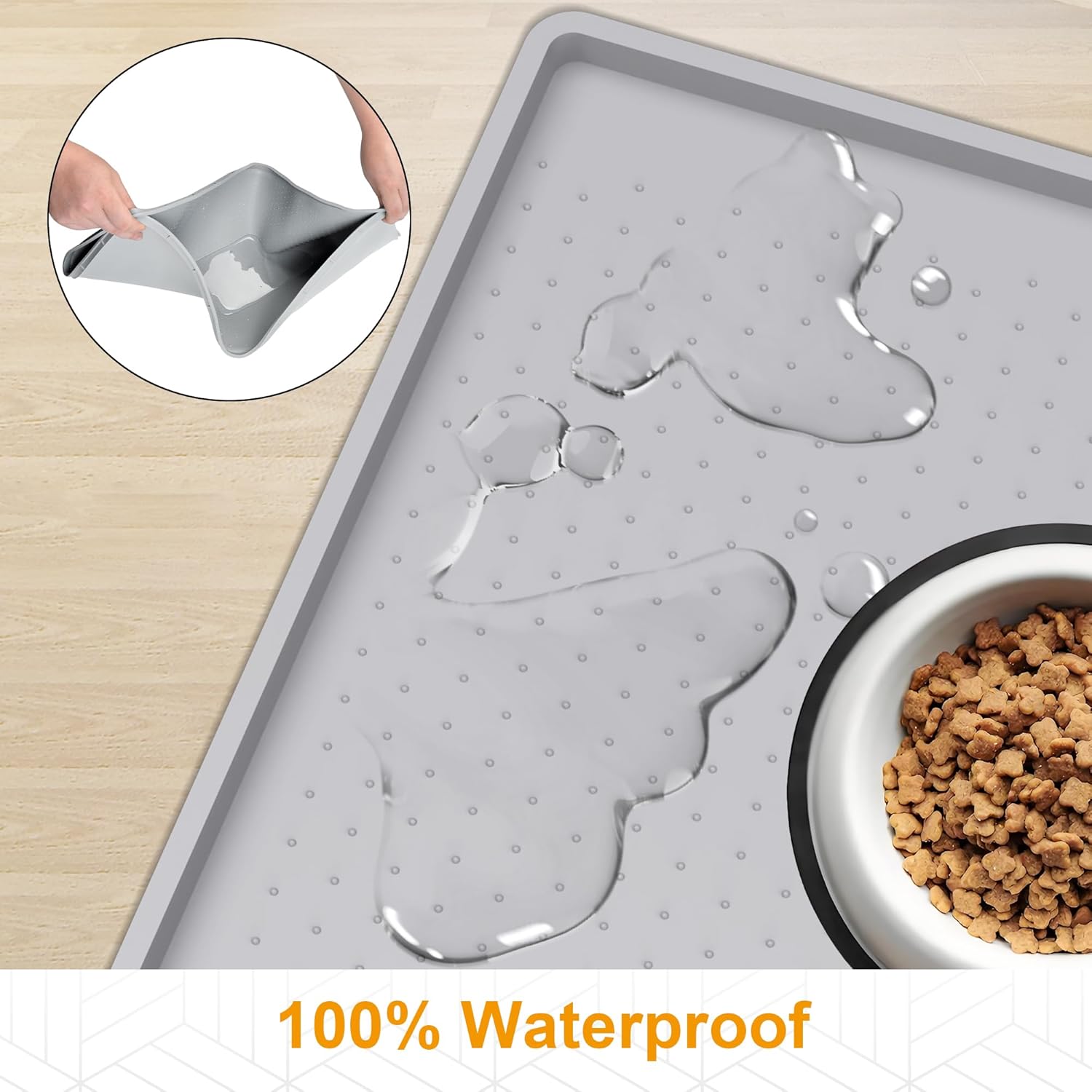 - Effective: Super raised outer lip (edge) keeps all the mess contained on the pet food mat and away from your floor. Use this cute waterproof mat for food and water under pet food bowls for dogs, water dishes, pet fountains, automatic feeders, feeding stations to protect your floors. You can even use it for your cat or other pets