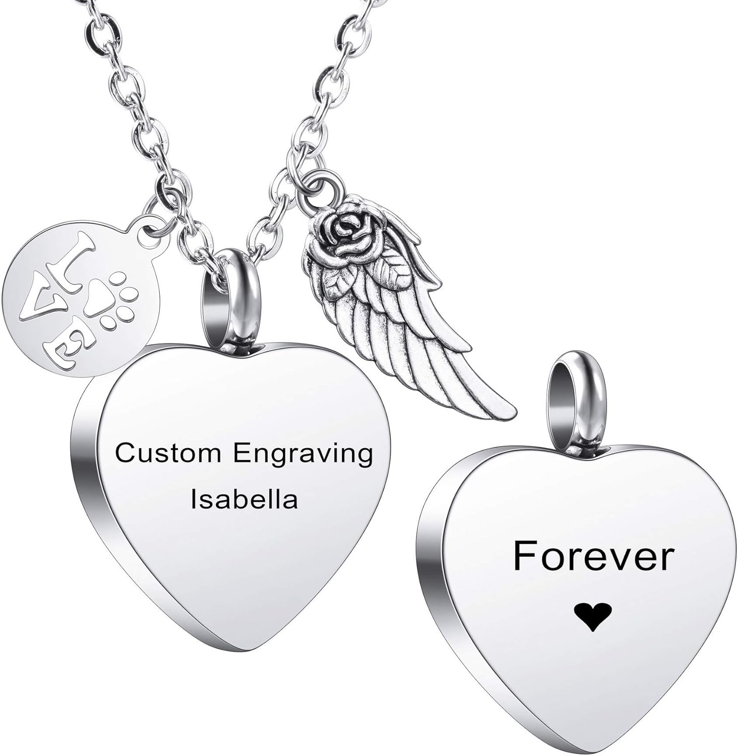 MeMeDIY Personalized Heart Paw Print Ashes Urn Pendant Necklace Custom Name/Photo/Date for Women Men Pet Lover Stainless Steel Memorial Dog Cat Pet Keepsake with Funnel Fill Kit Angel Wing