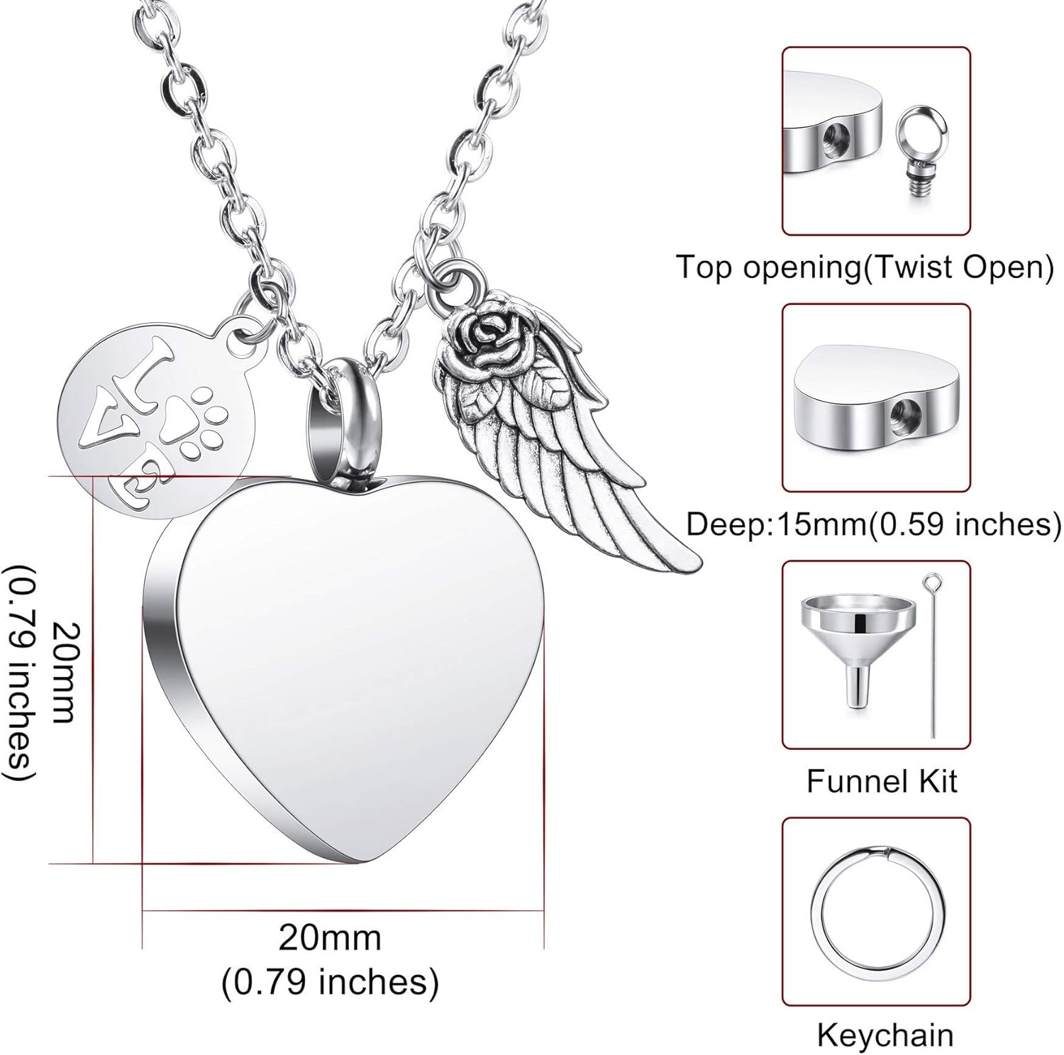 - 🐾 【PACKAGE】 - ① Silver Color Heart-Shaped Urn Pendant ② One Angel Wing Pendant. ③ One"With Love" Round Pendant. ④ One Keyring, you have the option of replacing the chain with a keychain. ⑤ One Set Of Funnel Kit, it helps you fill the ashes in cremation urn. ⑥ One 2-Inche Extension Chain, It helps you adjust the length of your necklace between 18 and 20 inches.