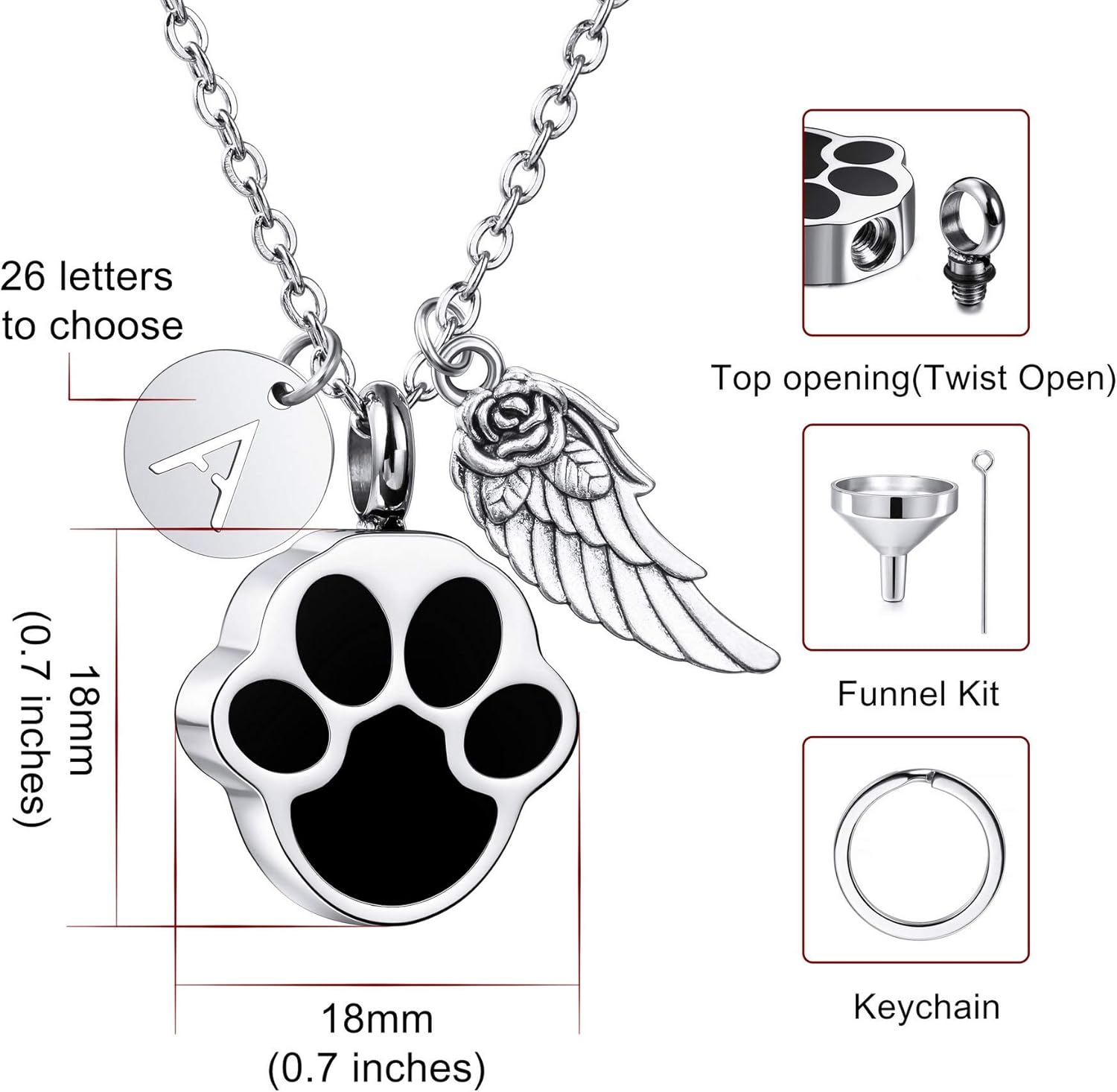 - 🐾 【PACKAGE】 - ① Paw Print Urn Pendant. ② One Angel Wing Pendant. ③ One little Initial Letter Pendant. ④ One Keyring, you have the option of replacing the chain with a keychain. you have the option of replacing the chain with a keychain. ⑤ One Set Of Funnel Kit, it helps you fill the ashes in cremation urn. ⑥ One 2-Inche Extension Chain, It helps you adjust the length of your necklace between 18 and 20 inches.