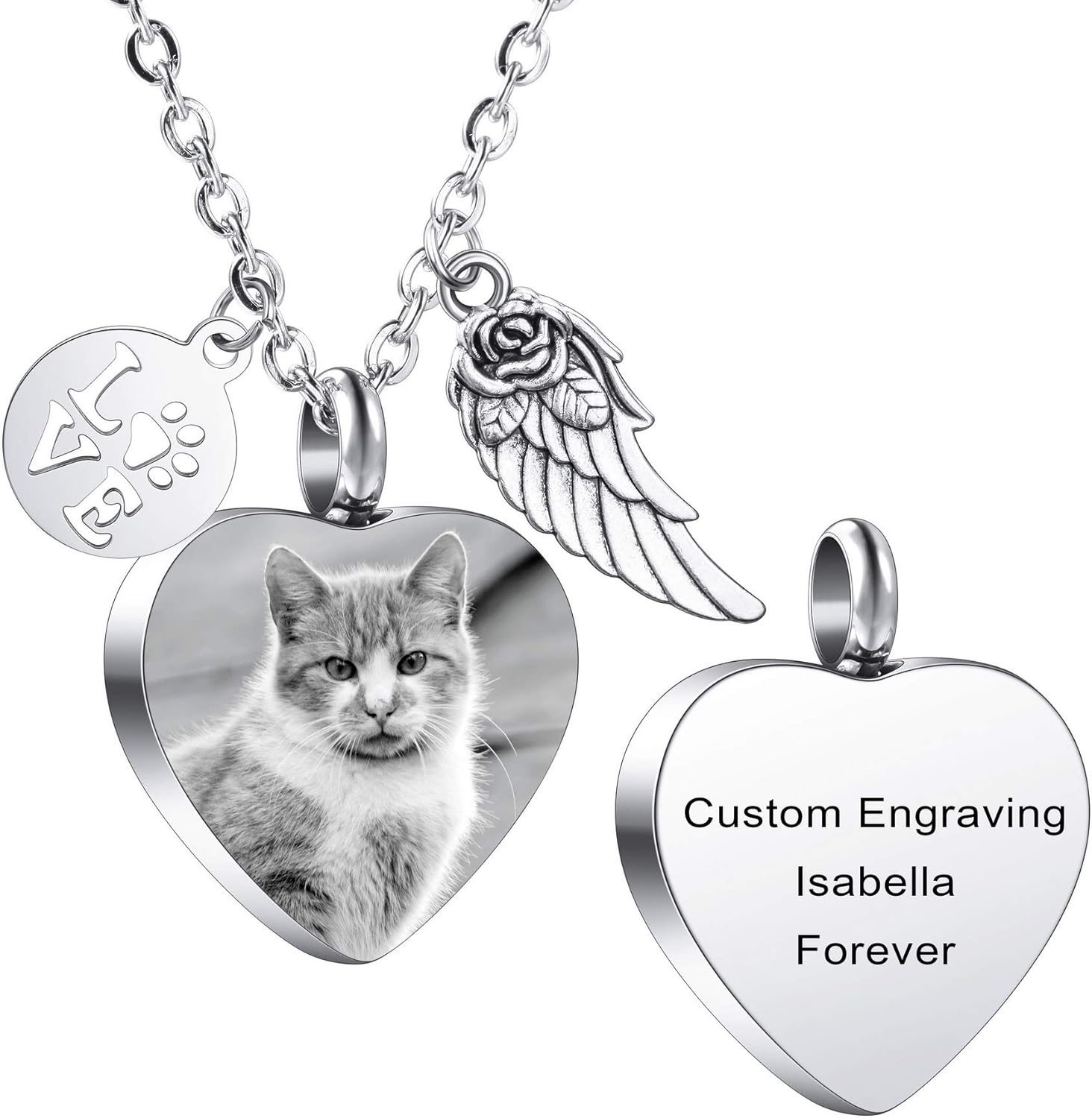 MeMeDIY Personalized Heart Paw Print Ashes Urn Pendant Necklace Custom Name/Photo/Date for Women Men Pet Lover Stainless Steel Memorial Dog Cat Pet Keepsake with Funnel Fill Kit Angel Wing