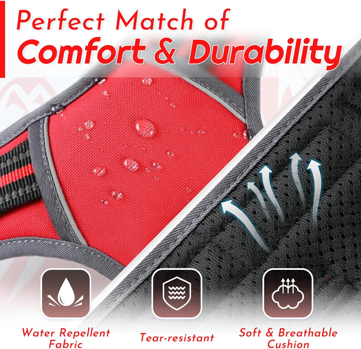 - Safer & More Comfortable - This no choke harness is specially built to distribute pressure evenly and safely around your dogs' chest rather than sensitive neck, thus preventing choking; Nylon webbing with reflective material ensures good visibility when night running; Breathable mesh lining with soft sponge padding plate prevents dog injuries, giving extra comfort and protection; Now you can walk with full control over the movements of your doggie without pain and stress at its neck