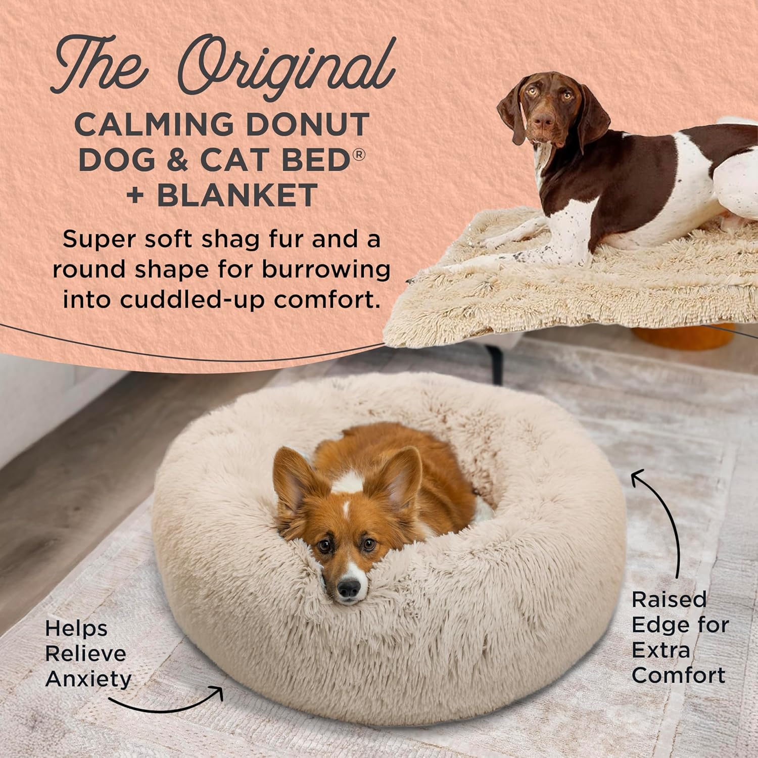 Best Friends by Sheri Bundle Set The Original Calming Shag Donut Cuddler Cat and Dog Bed + Pet Throw Blanket, Taupe, Medium 30x30