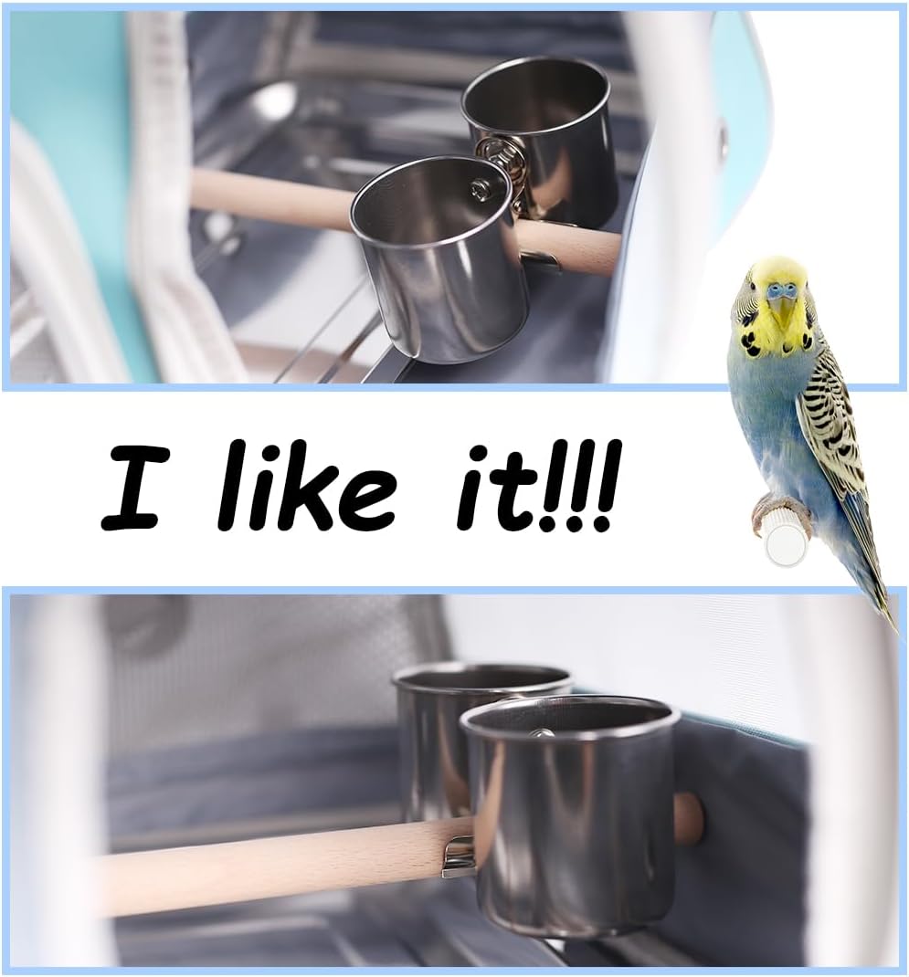 Bird Feeder Cups with Clamp Mount on Standing Perch, 2 Stainless Steel Cups for Food and Water, Compatible for halinfer's All Bird Carrier and Backpack Wooden and Rope Perch