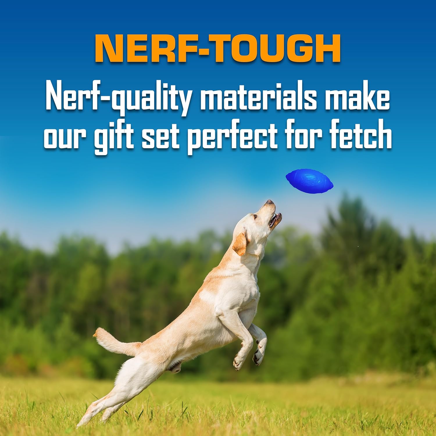- Fetch and Tug Dog Toys: Three-piece Nerf Dog gifts set, including Classic Squeak Football, 3-Ring Tug and Nitro Blitz Squeak Football, ideal dog fetch toys and tug toys for large dogs and medium dogs