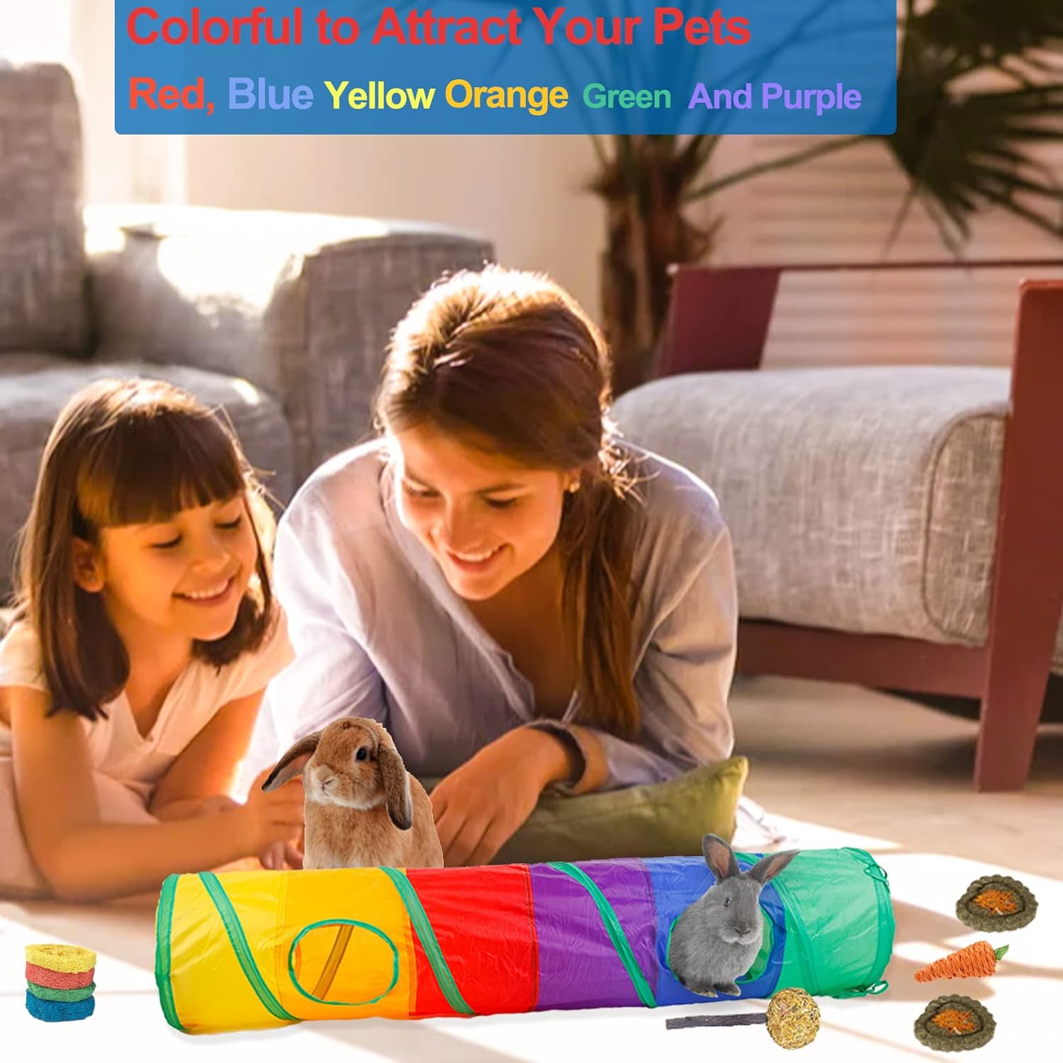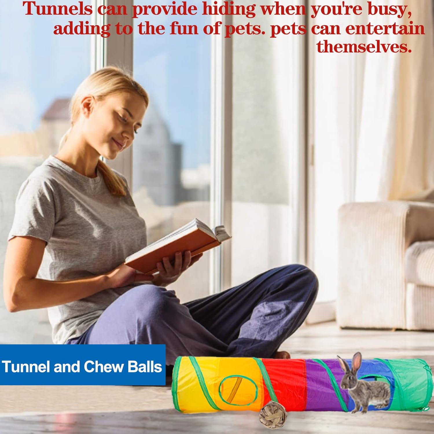 - 【Rabbit ChewToys】In addition to tunnel toys, we also provided chew toys. Exercise the rabbit's biting ability. The grass ball can grind teeth and protect the pet's teeth from growing and hurting the pet itself.