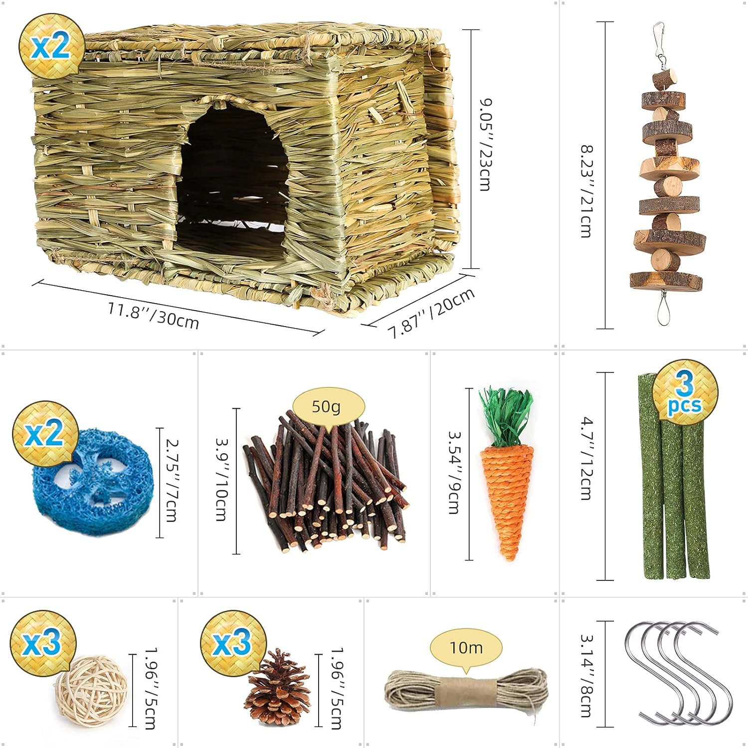 - 🐇The woven grass beds are made of natural dry grass, has its own organic grass fragrance that makes the pet feel relaxed, as if they are in their natural homes. Your beloved pet will enjoy their food as if in a natural environment. Cool in summer and warm in winter. The little toys in our package will be liked by your pets, because they are healthy and cute. The rope and S-shaped hooks could help to hang the grass house wherever you need
