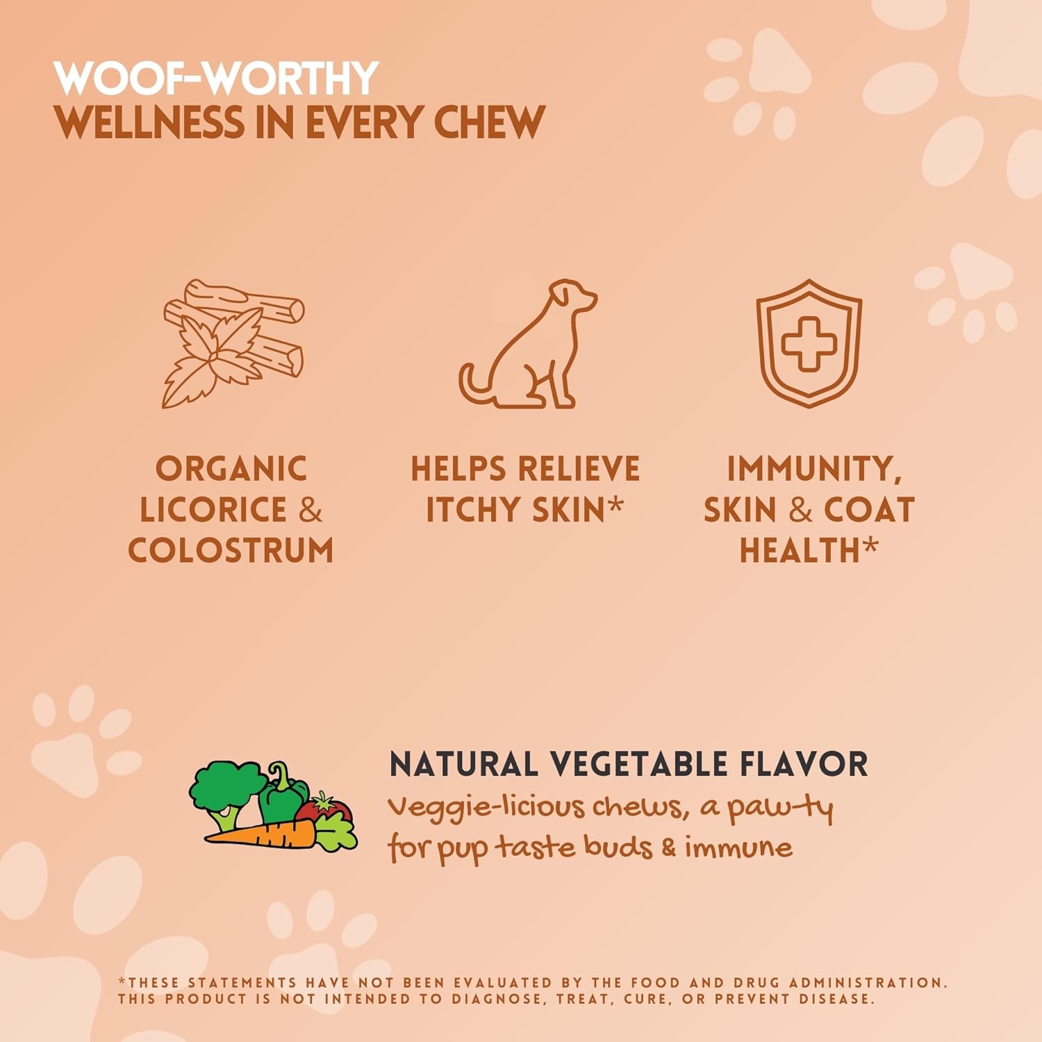 - 120 PAWESOME IMMUNE CHEWS: Our yummy veggie flavored dog chews are rich in Kelp, Colostrum, and Vitamin C that support your furry friend’s immunity, year-round good health and wellness.