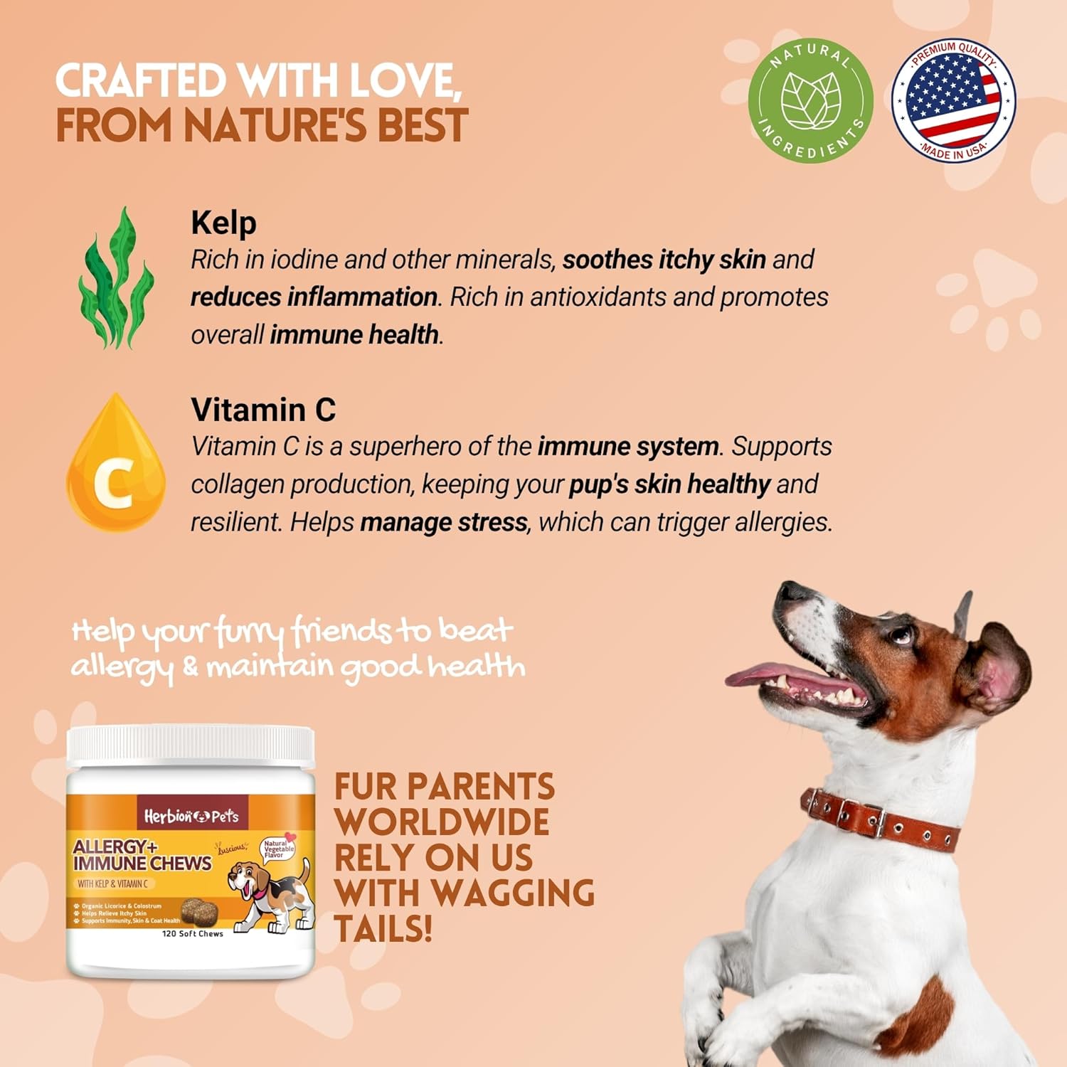 - ALL-NATURAL ALLERGY RELIEF: Whether your fur babies suffer from seasonal, skin, food, or environmental allergies, Herbion Pets has the pawfect solution for you. Our Allergy + Immune Chews protect dogs 12 weeks and above from internal and external allergy symptoms. For dosage according to weight, please refer to the chart mentioned on the label.