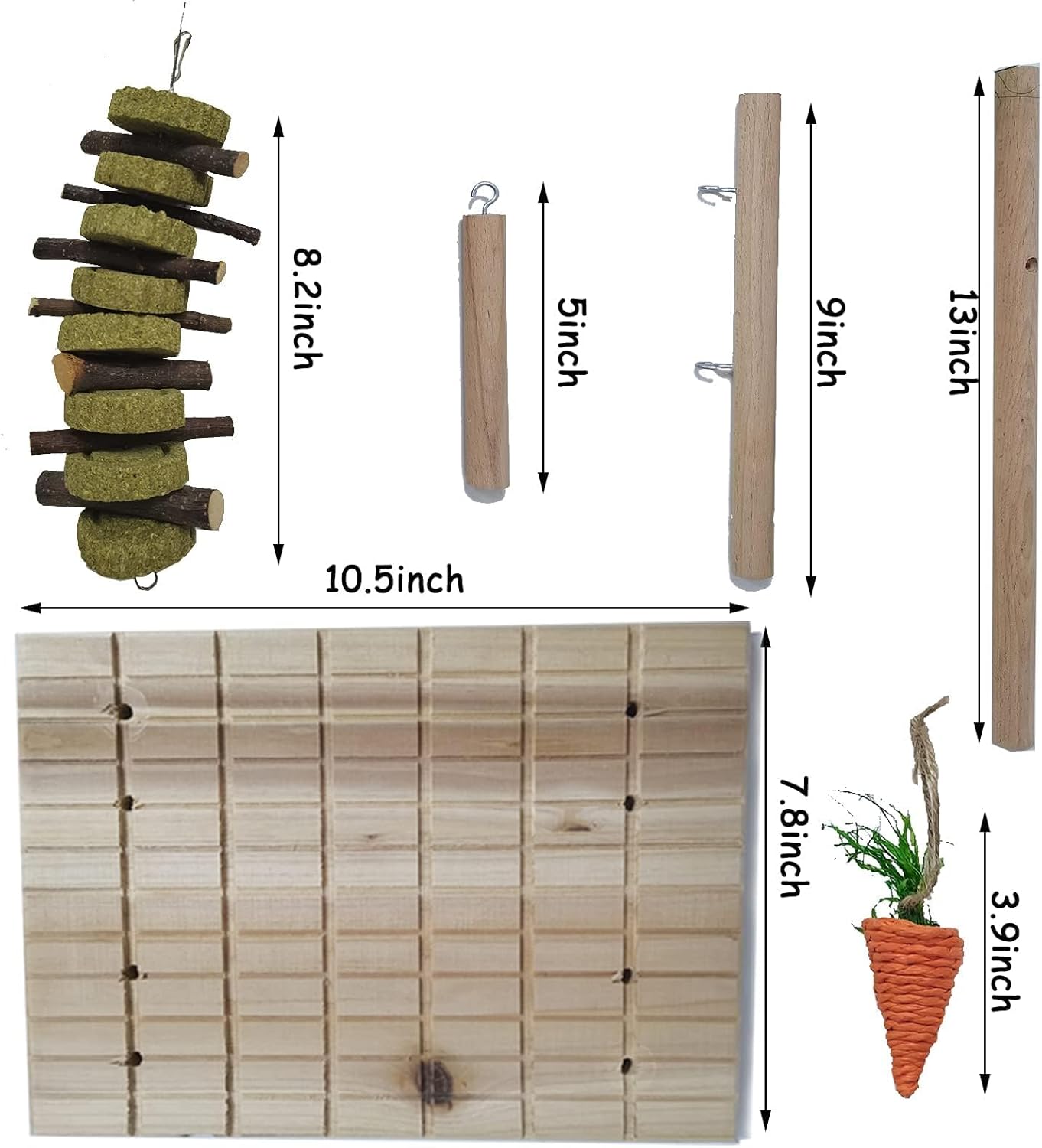 - 【Size】The pet wood platform10.5*7.8*13 inches(L*W*H),Timothy chew toy for teeth4.7*7.8 inches(L*H),carrot toy3.9 inches(L)