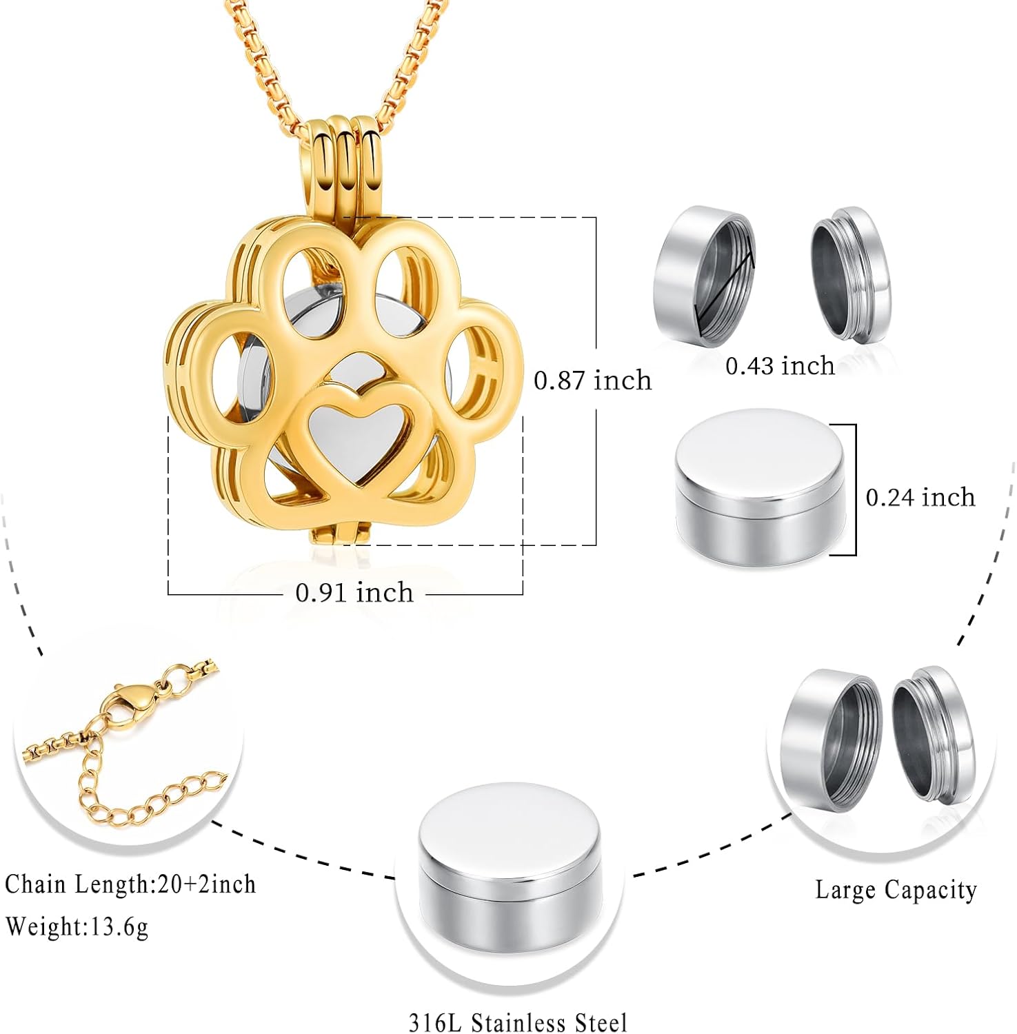 • šŸ¾ć€Size怑Cremation urn pendant size is 0.78 inches (Length) * 0.68 inches (Width); Weight: above 13.6g; Urn necklace come with adjustable 20ā€+ 2ā€ extension chain, this length works great for about everyone,you can adjust as you need.