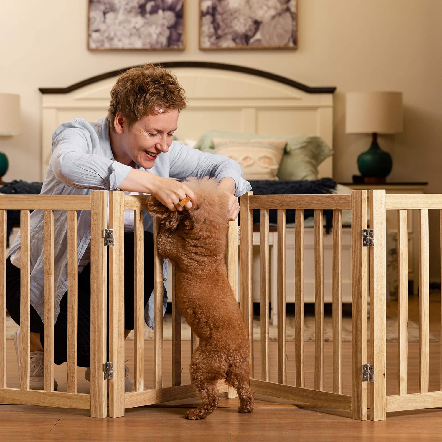 LZRS 4-Panel Wooden Free Standing Foldable Dog Gate Indoor – 24" High, Extra Wide Step-Over Safety Pet Gate for Doorways, Stairs, Hallways, Large Spaces & Playpen for Puppies Indoor Use, Natural